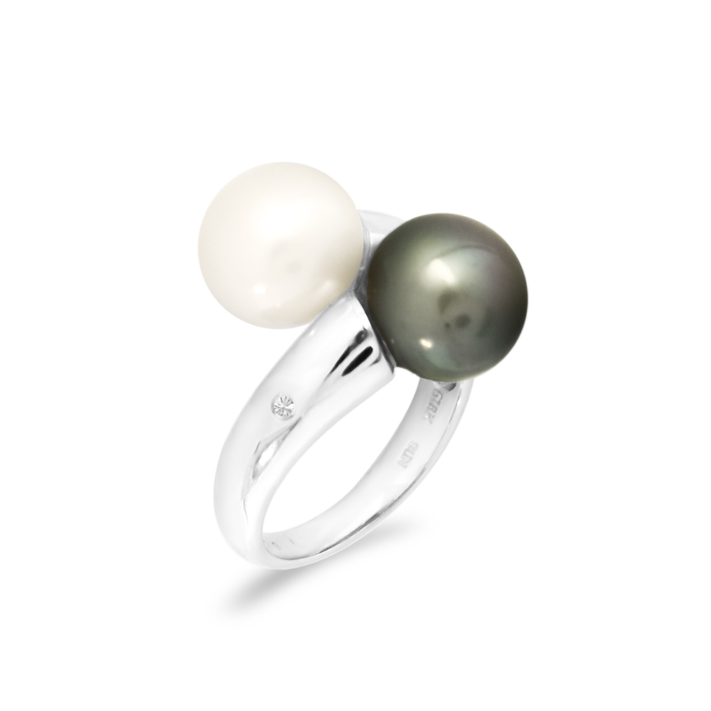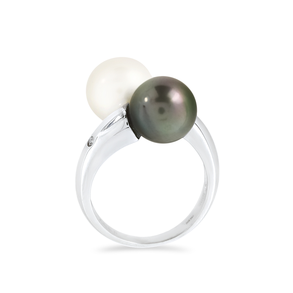 • Ένα υπέροχο δαχτυλίδι από 18 καράτια λευκόχρυσου με 1 λευκό και 1 μαύρο μαργαριτάρι South Sea Pearl, άριστης ποιότητας διαμέτρου 12.1 χιλιοστών και 2 διαμάντια 0.02 καρατίων.
