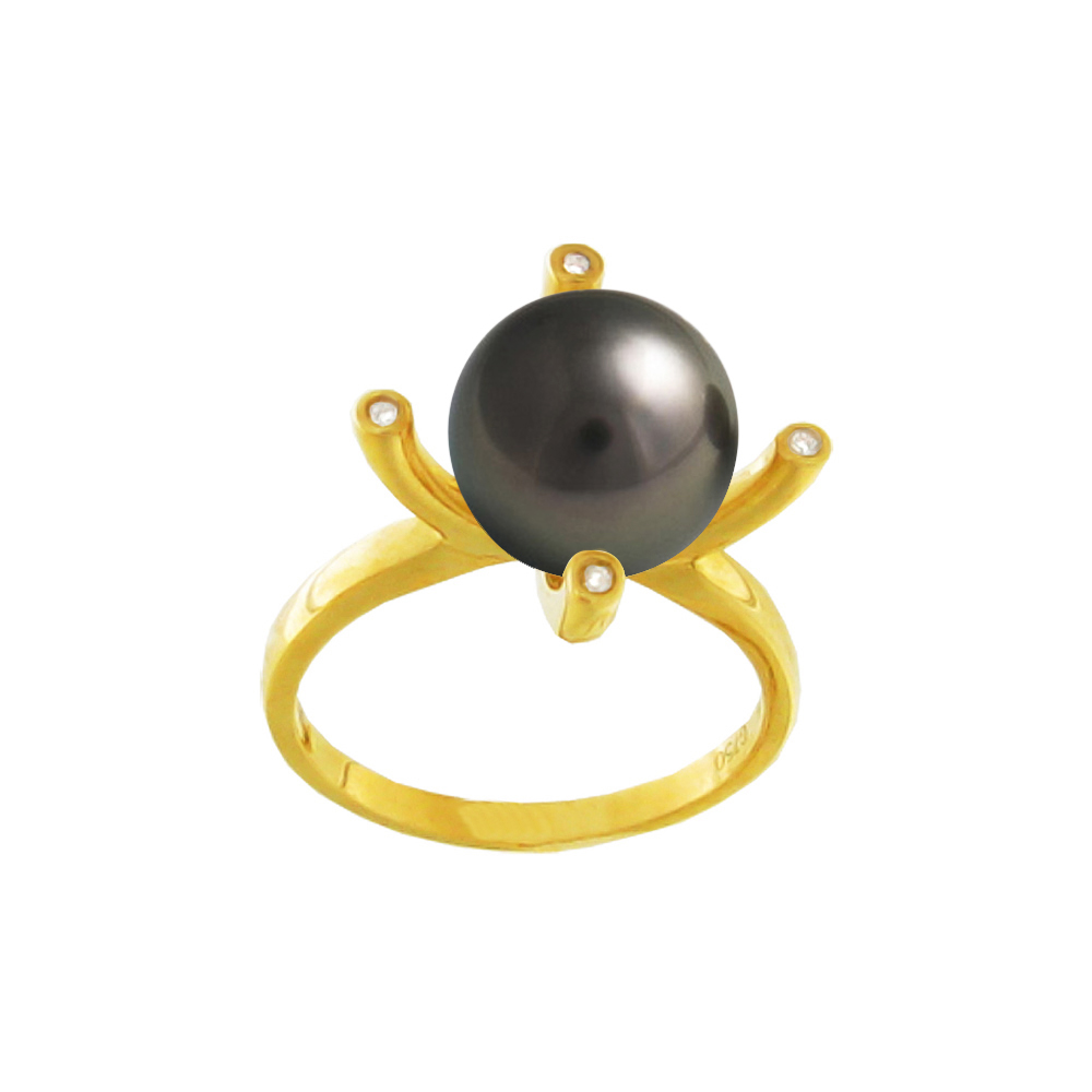 • Ένα μοναδικό δαχτυλίδι από 18 καράτια χρυσού ή λευκόχρυσου, με μαύρο μαργαριτάρι QTV Akoya Pearl, άριστης ποιότητας διαμέτρου 10,0 - 10,5 χιλιοστών και 4 διαμάντια 0.03 καρατίων.