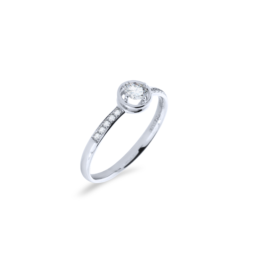 • Ένα εντυπωσιακό μονόπετρο δαχτυλίδι από λευκόχρυσο 18 καρατίων με ένα κεντρικό διαμάντι βάρους 0,178 καρατίων, καθαροτητας VS1 και κοψίματος Μπριγιάν..