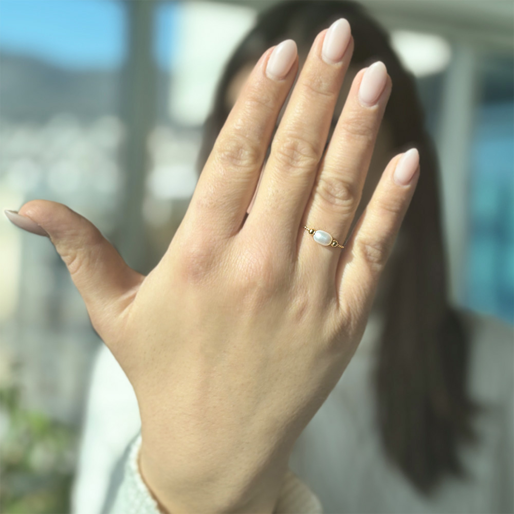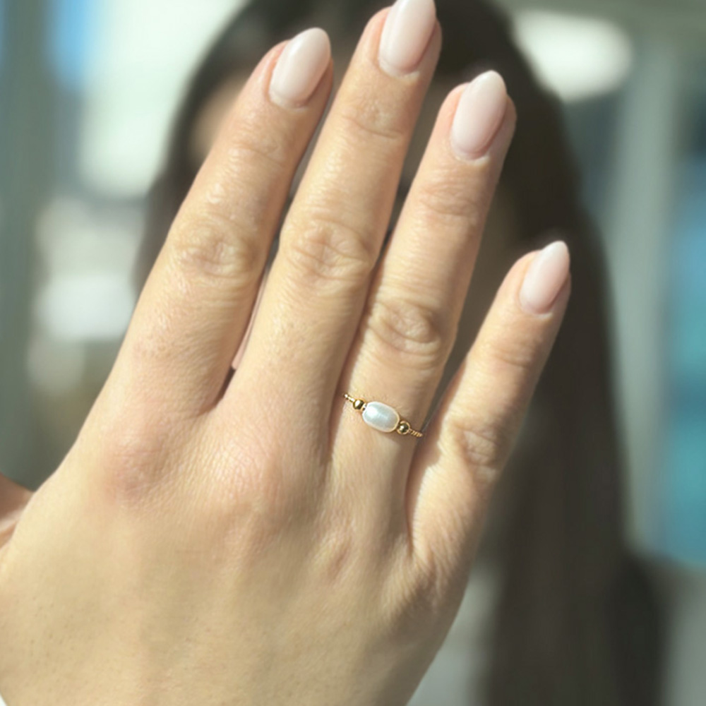 • Ένα υπέροχο δαχτυλίδι από επιχρυσωμένο μέταλλο με λευκό μαργαριτάρι Fresh Water Pearl διαμέτρου 6x7 χιλιοστών σε σχήμα Long.