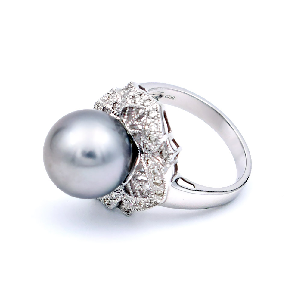 • Ένα υπέροχο δαχτυλίδι από 18 καράτια λευκόχρυσου με γκρι μαργαριτάρι South Sea Pearl, άριστης ποιότητας διαμέτρου 12,2 χιλιοστών και 36 διαμάντια 0,25 καρατίων.