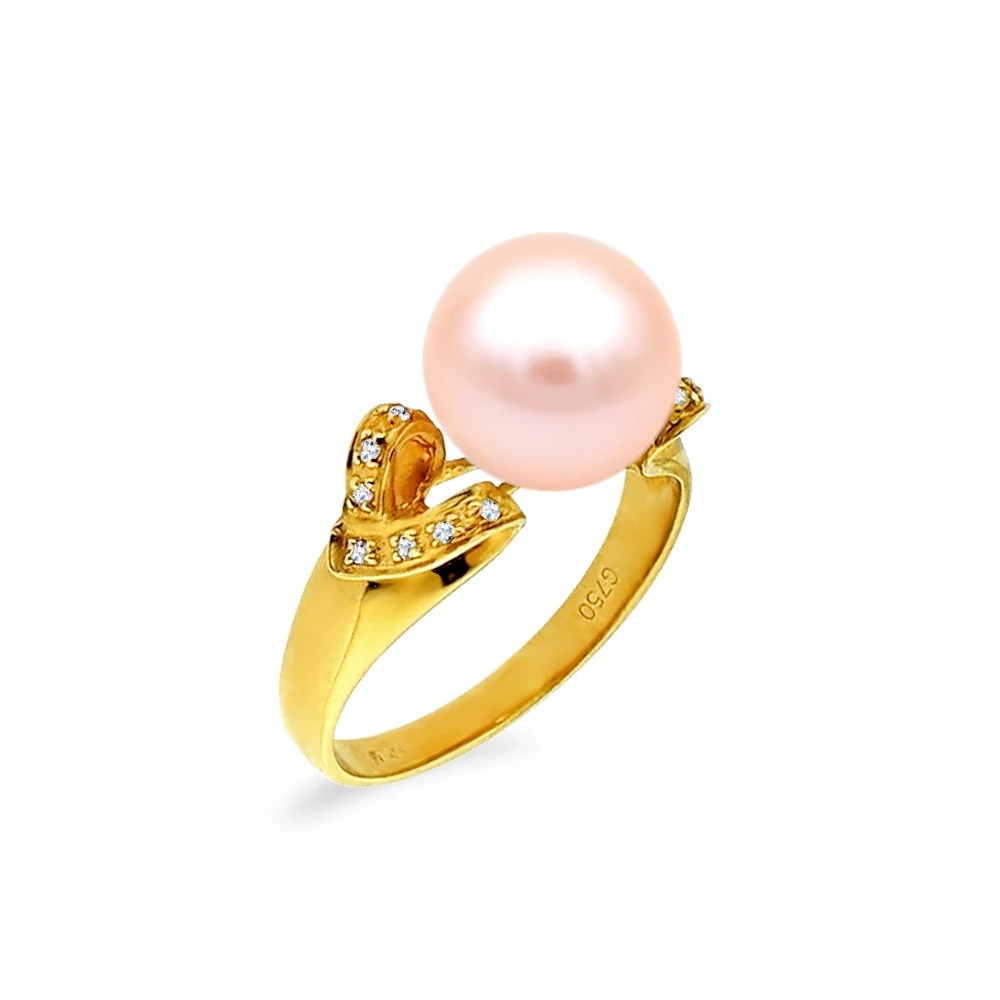 • Ένα φανταστικό δαχτυλίδι με σομόν ολοστρόγγυλο μαργαριτάρι θαλάσσης QTV Akoya Pearl, άριστης ποιότητας διαμέτρου 10-10,5 χιλιοστών.
