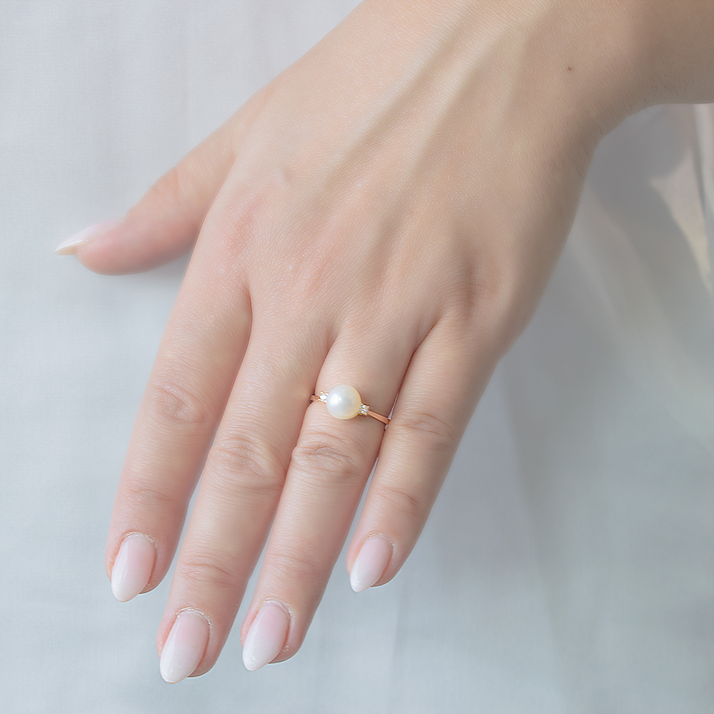 • Ένα υπέροχο δαχτυλίδι με λευκό μαργαριτάρι Q.T.V. Akoya JAPAN διαμέτρου 7,5-8 χιλιοστών σε σχήμα Round.