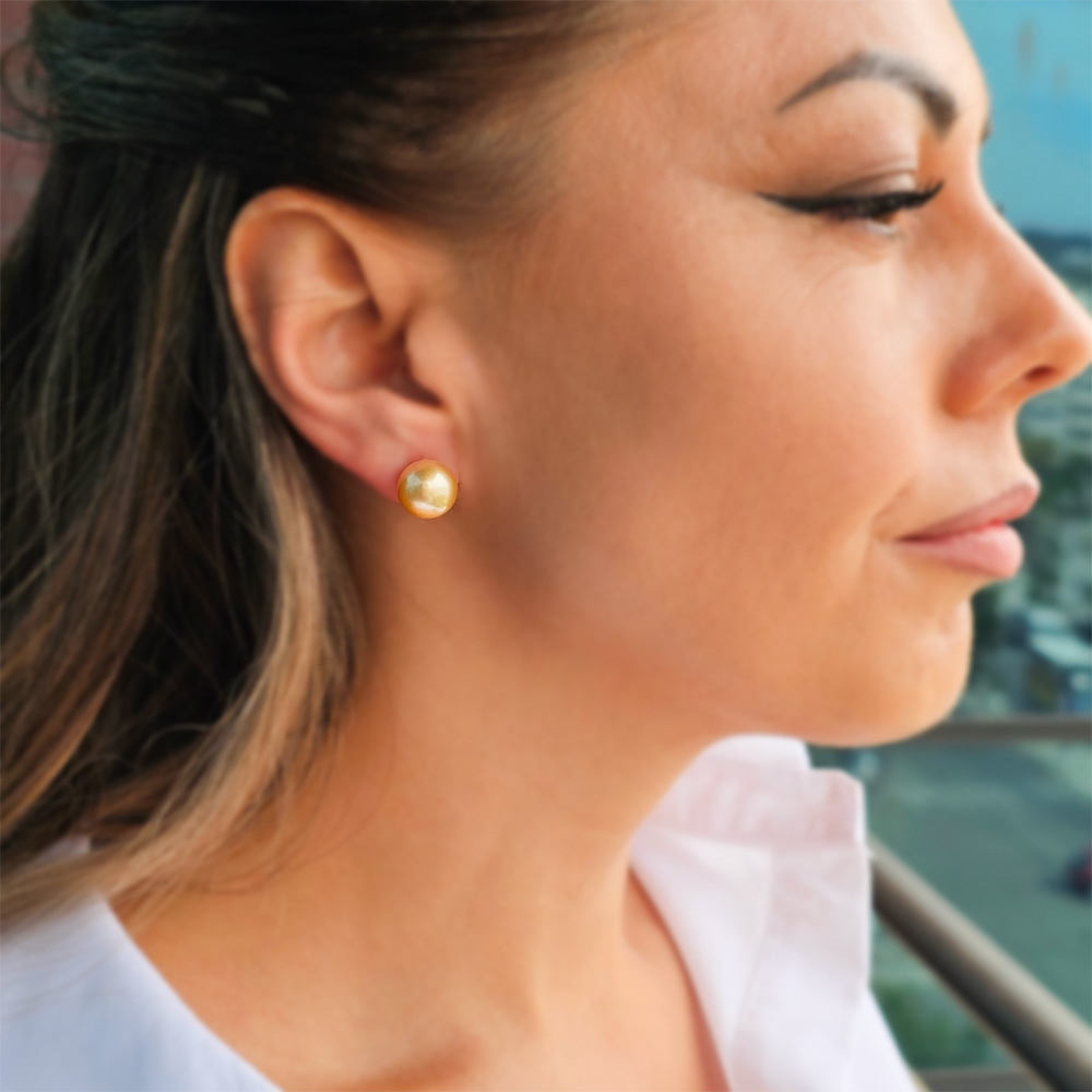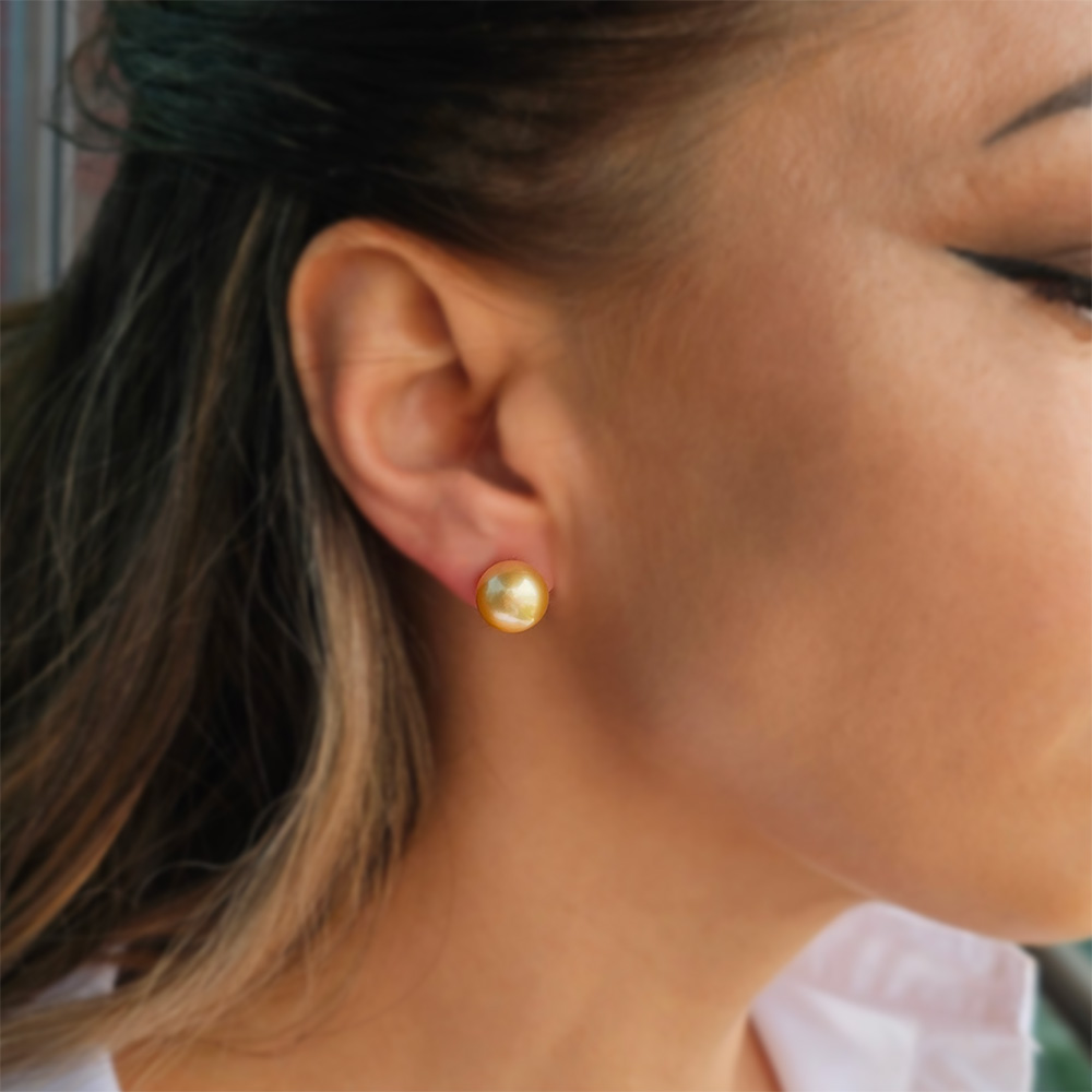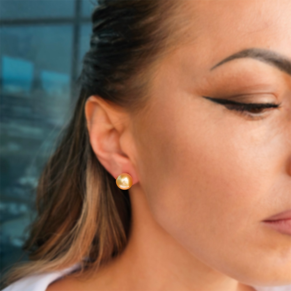 • Ένα υπέροχο ζευγάρι καρφωτά σκουλαρίκια με 2 σπάνια και εντυπωσιακά φυσικά Gold South Sea μαργαριτάρια διαμέτρου 11,5 χιλιοστών άριστης ποιότητας και βάρους 14,75 MOMME.