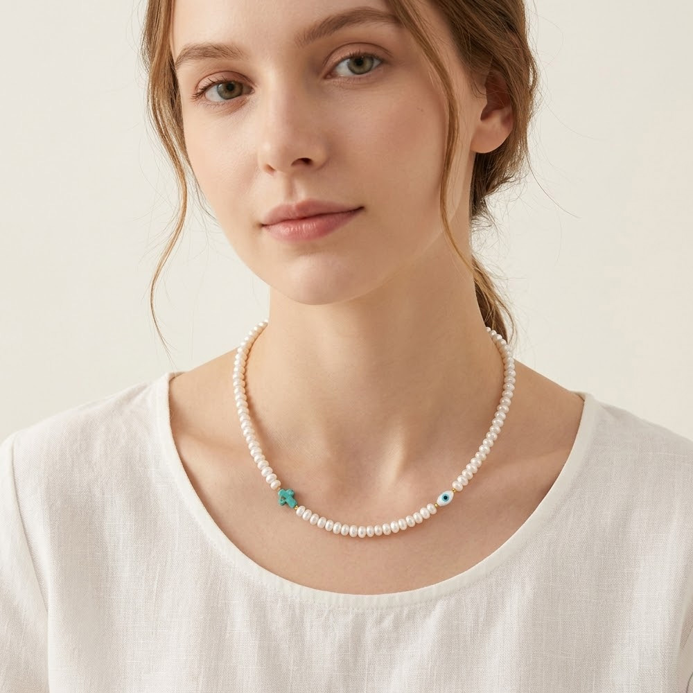 Το κολιέ κοσμούν ένας σταυρός από τιρκουάζ διαμέτρου 8x10 χιλιοστών και από την άλλη ένα μάτι από Mother of Pearl διαμέτρου 5x11 χιλιοστών ανάμεσα σε 4 χρυσές μπίλιες 14 καρατίων.