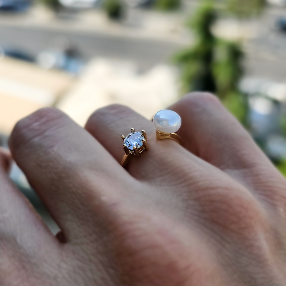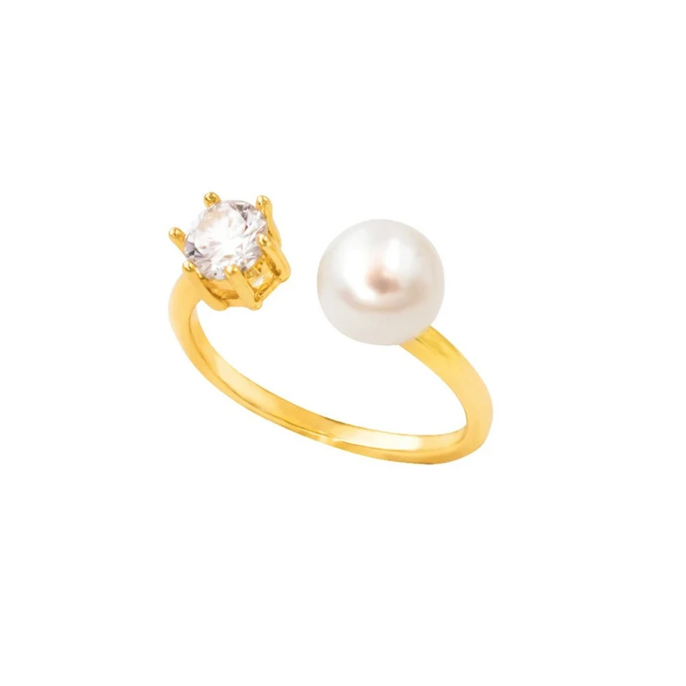 • Ένα δαχτυλίδι με λευκό μαργαριτάρι Fresh Water Pearl διαμέτρου 7 χιλιοστών. Η βάση του είναι από επιχρυσωμένο μέταλλο και είναι διακοσμημένη με ένα εντυπωσιακό ζιργκόν. Το ιδιαίτερό του σχέδιο καθιστά το δαχτυλίδι κατάλληλο για αρκετά νούμερα από Ν50-Ν56, καθώς ανοιγοκλείνει από το επάνω μέρος.