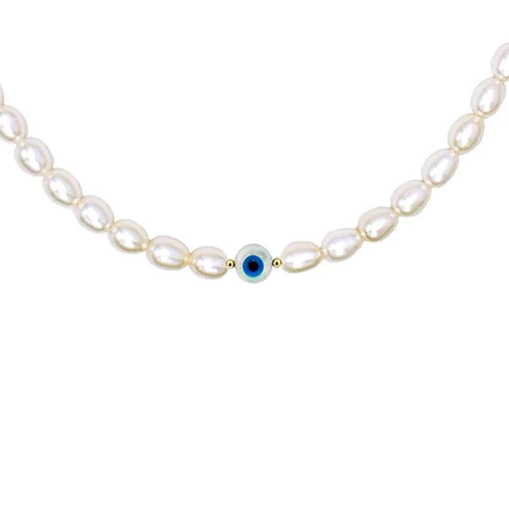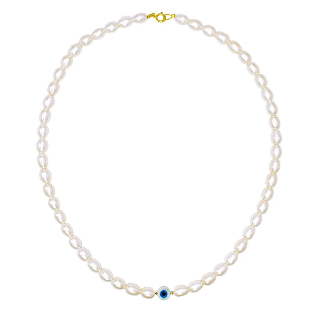 Κολιέ με Κ14 χρυσό κούμπωμα και λευκά μαργαριτάρια και ματάκι- M125076