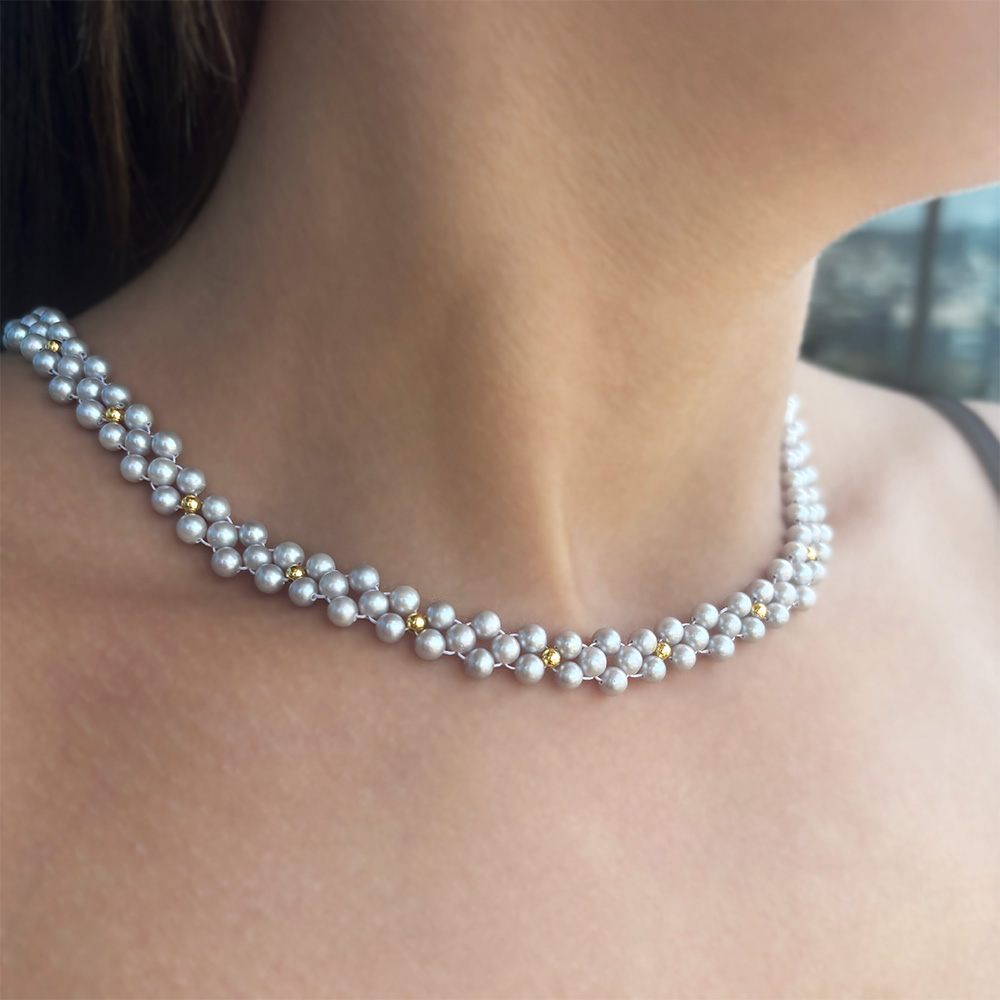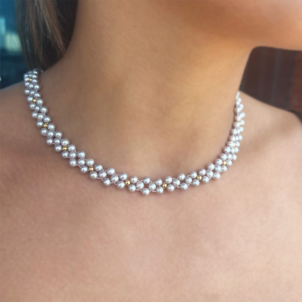 Κολιέ με Κ14 χρυσές μπίλιες και γκρι μαργαριτάρια - F126045