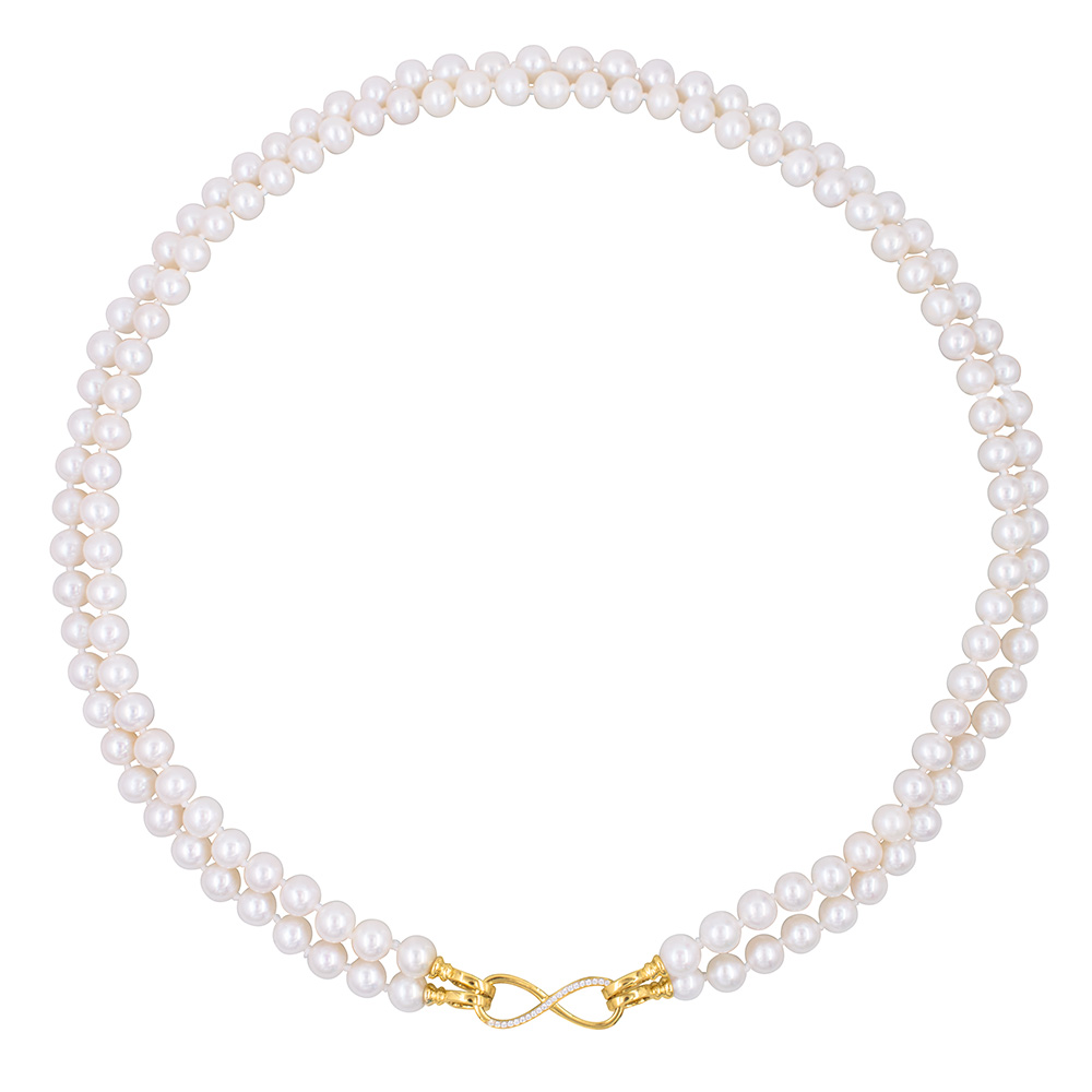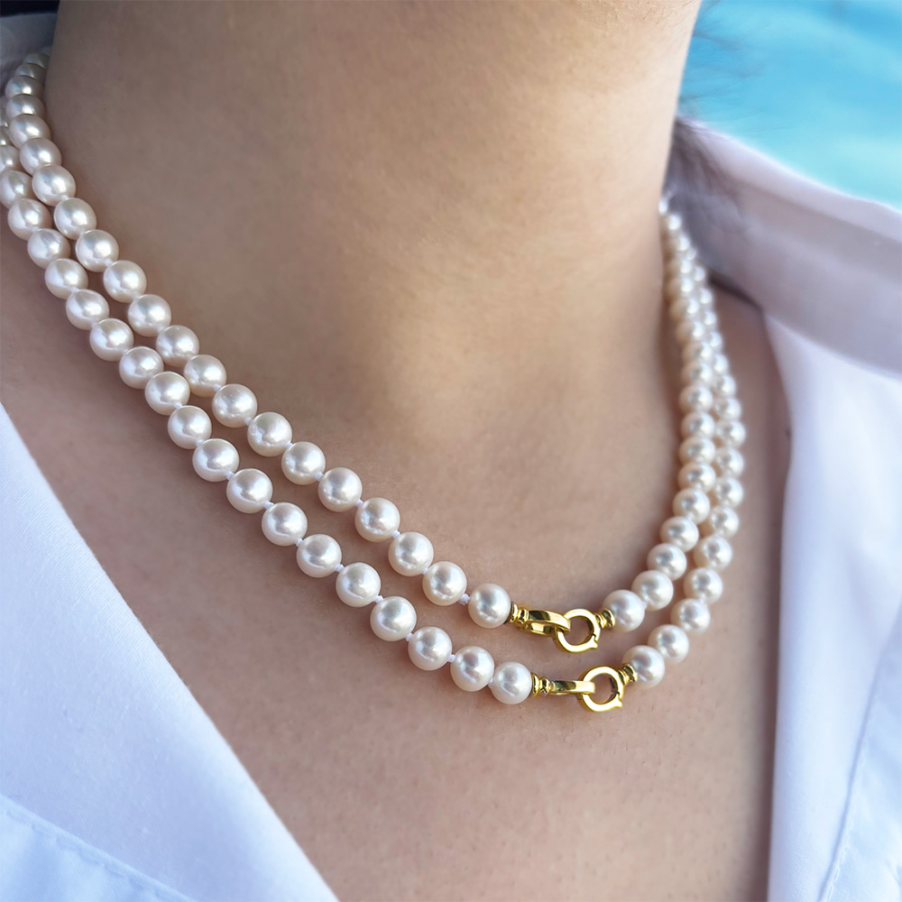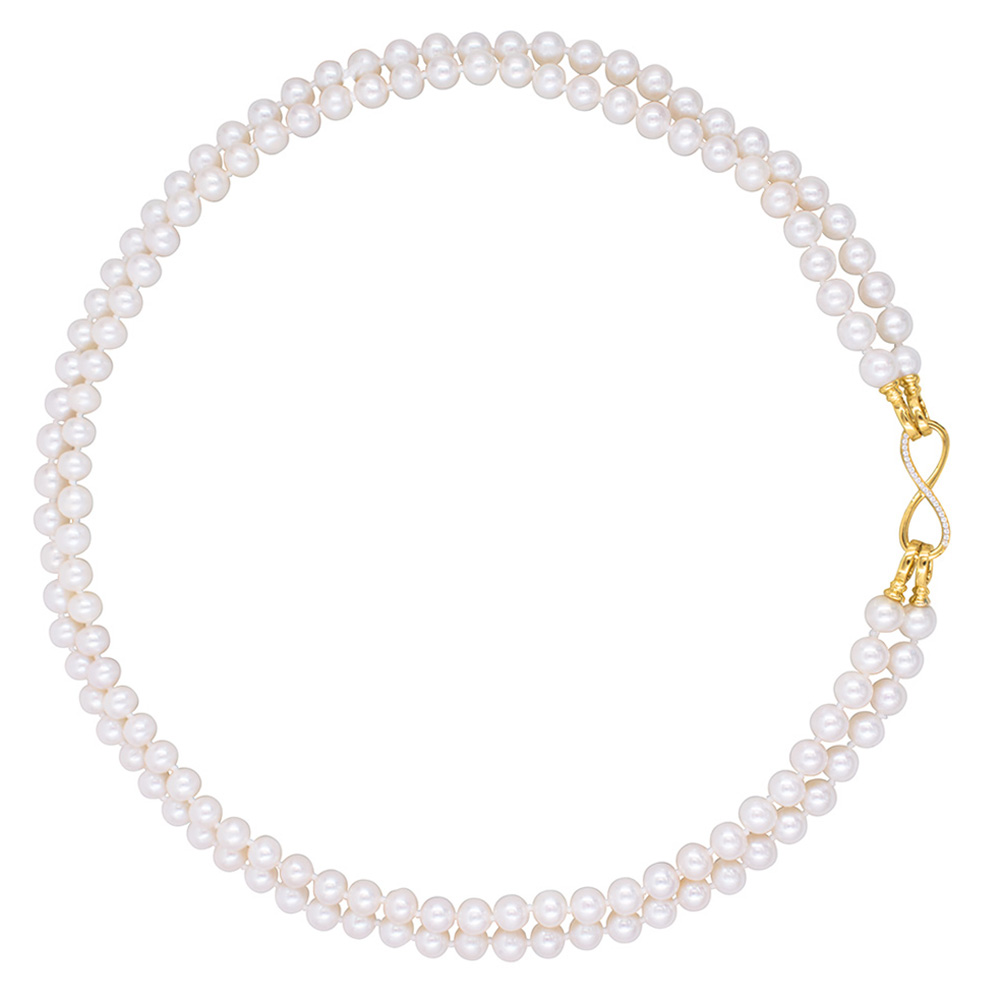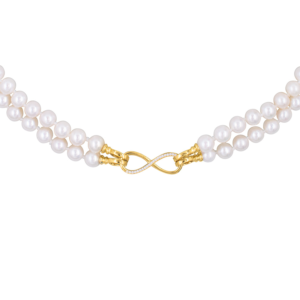 • Ένα υπέροχο κολιέ με 2 σειρές λευκά στρόγγυλα μαργαριτάρια Fresh Water Pearl διαμέτρου 6-6,5 χιλιοστών.