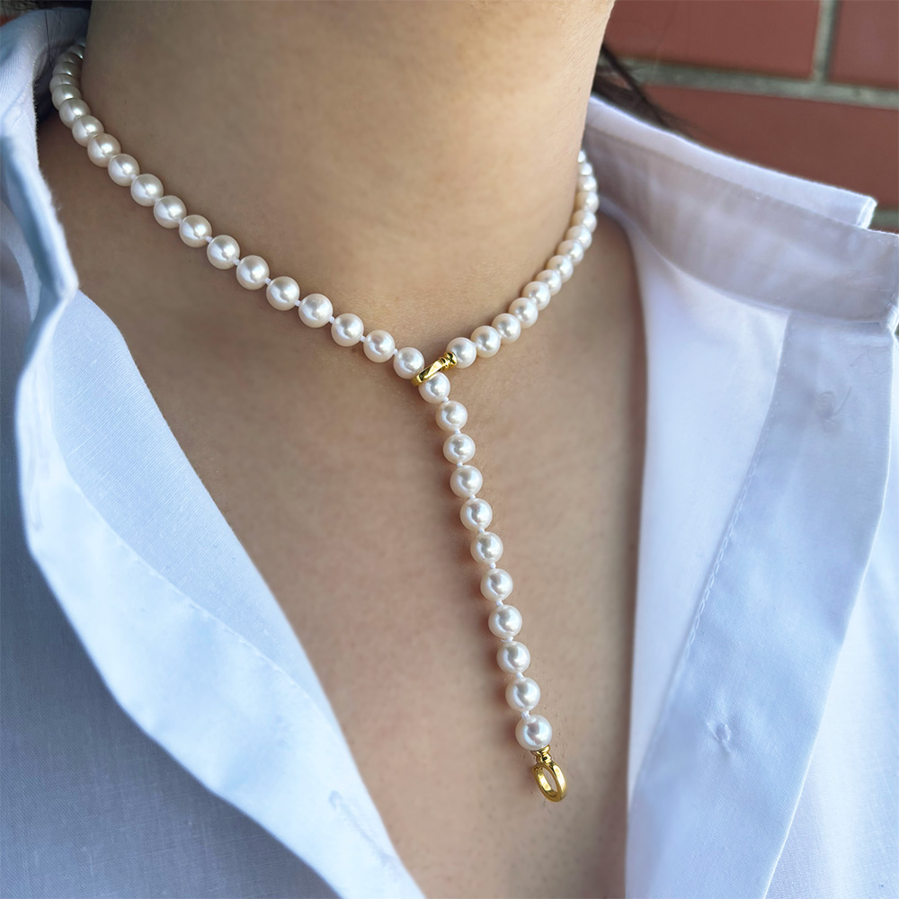 Είναι δεμένο σε μεταξωτό νήμα που δημιουργεί κόπμπους ενδιάμεσα στα μαργαριτάρια για λόγους προστασίας και ασφάλειας.