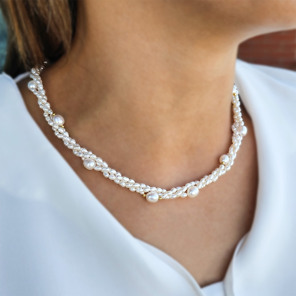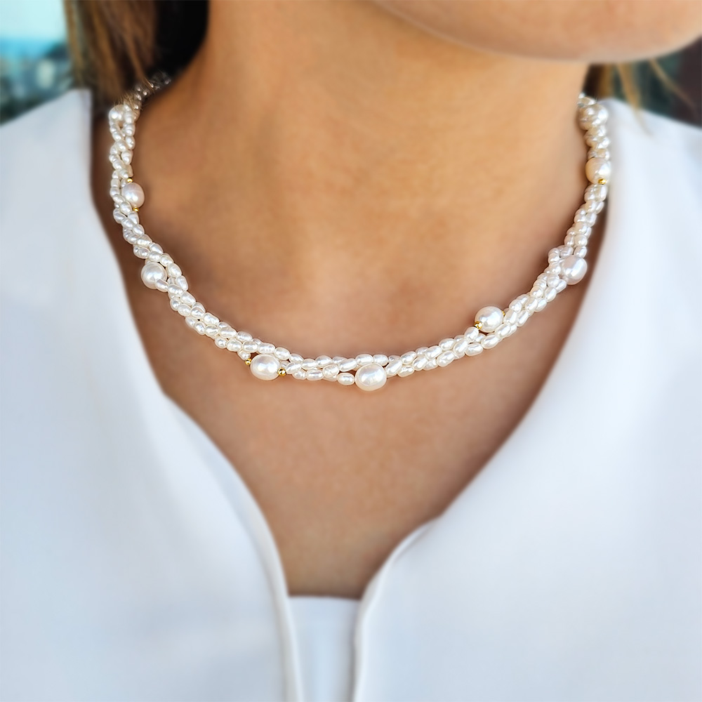 Ένα μοντέρνο κολιέ που συνδυάζει την κλασική ομορφιά των λευκών μαργαριταριών με τη λάμψη του χρυσού, που θα σας κάνει να εντυπωσιάζετε σε κάθε σας εμφάνιση.