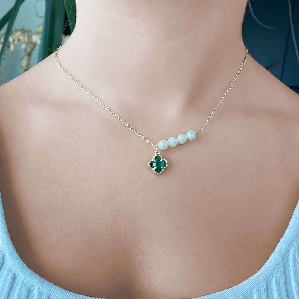Κολιέ με λευκά μαργαριτάρια και πράσινο ζιργκόν σε επιχρυσωμένη αλυσίδα - S125597