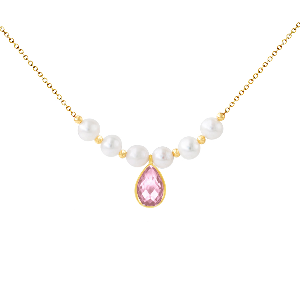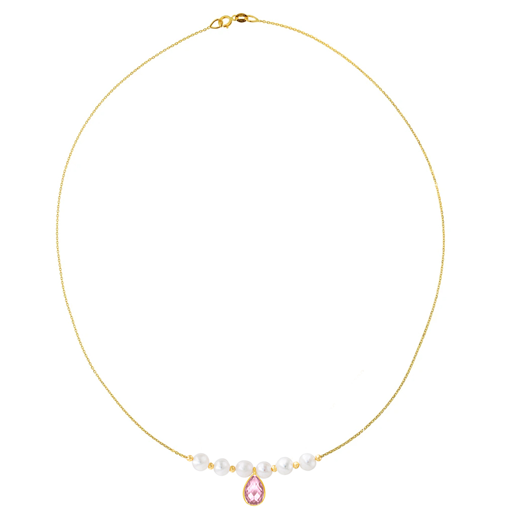 Κολιέ αλυσίδα Κ14 χρυσή με μενταγιόν pink quartz, μαργαριτάρια και χρυσά στοιχεία - F124908PQ