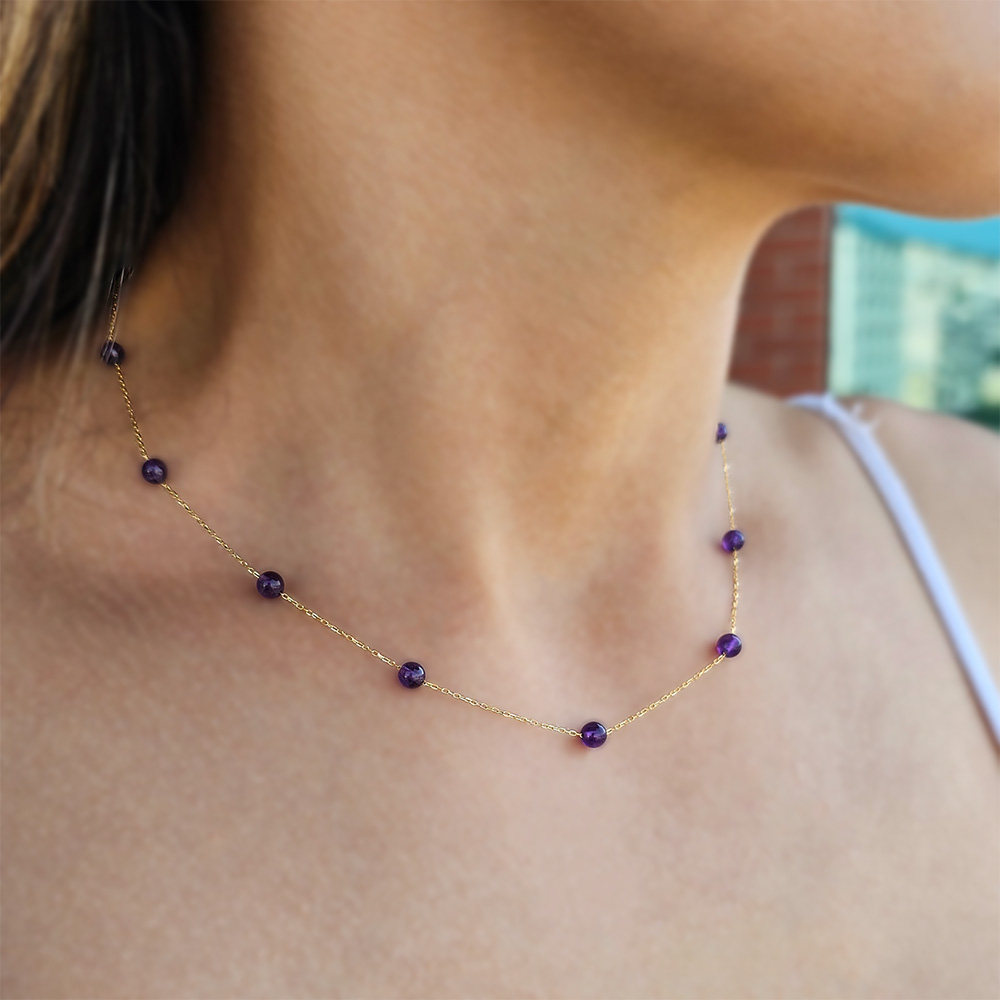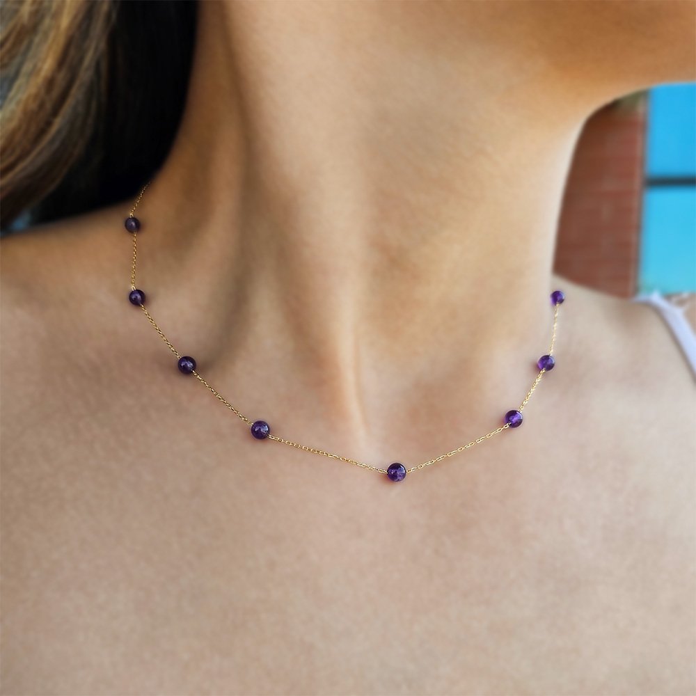 • Ένα υπέροχο κολιέ με 12 ημιπολύτιμους λίθους αμέθυστο διαμέτρου χιλιοστών λείας κοπής.
