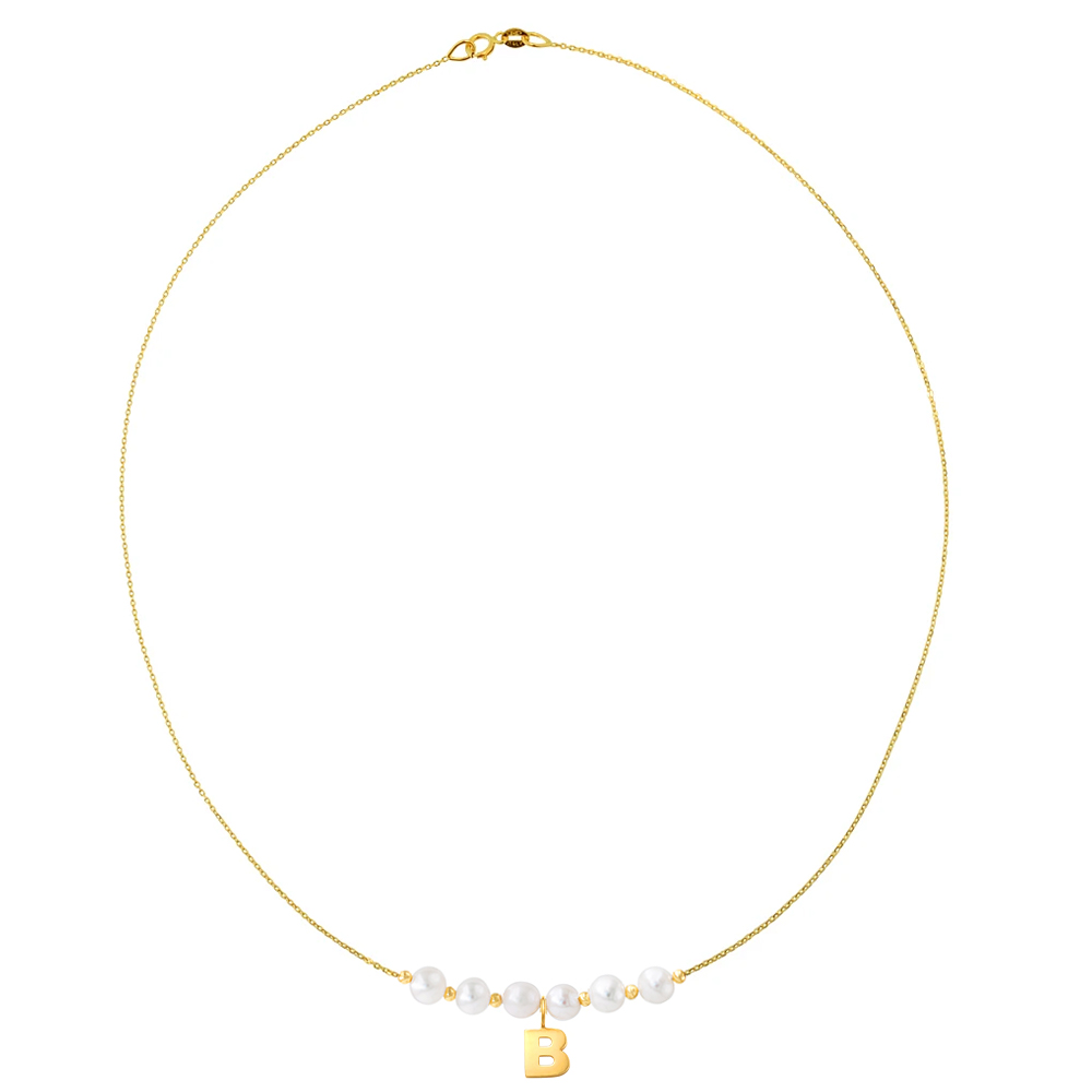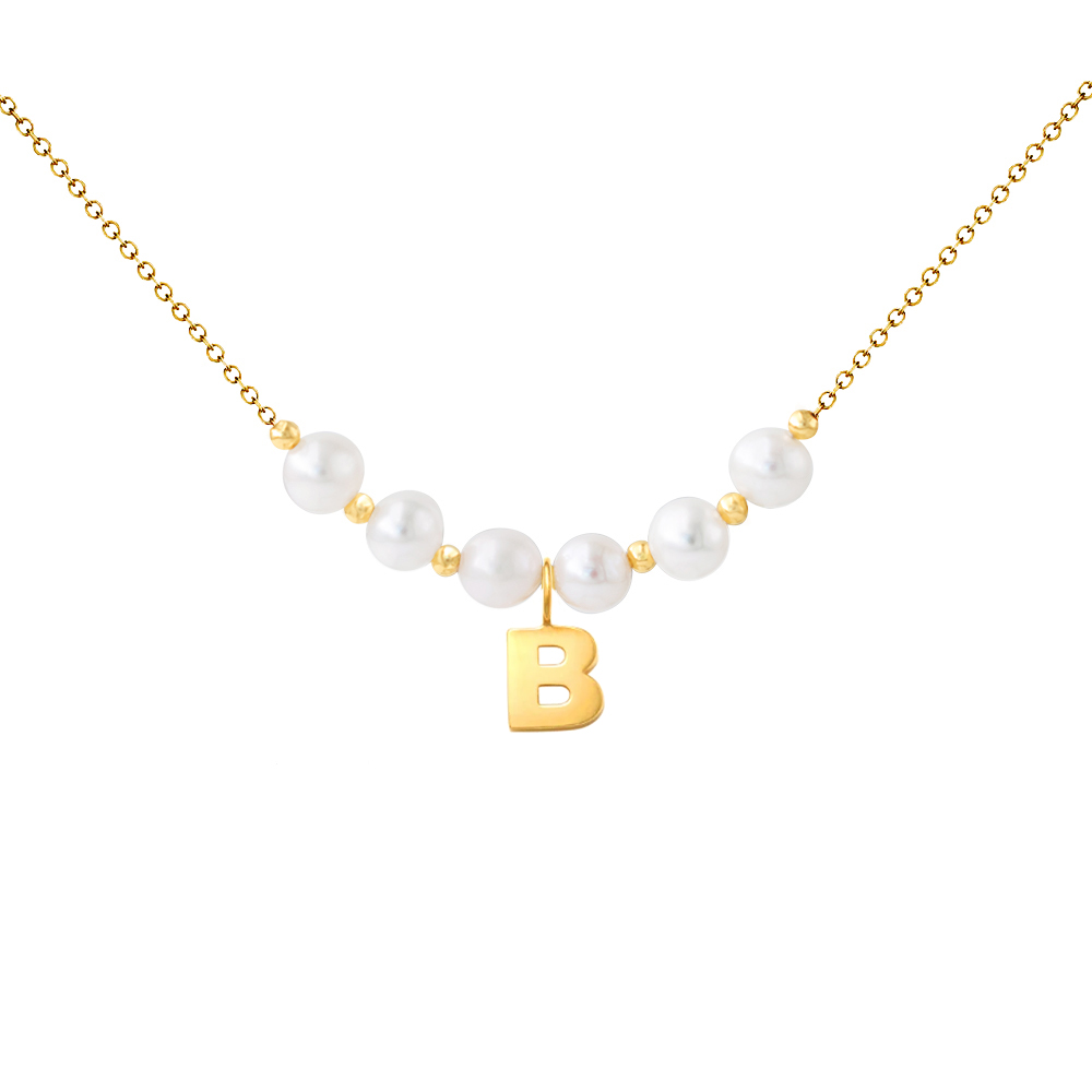 Κολιέ αλυσίδα Κ14 χρυσή με λευκά μαργαριτάρια και μενταγιόν μονόγραμμα - F124950B