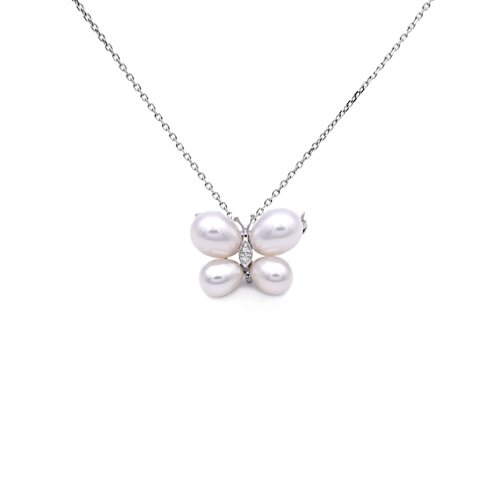 Κολιέ με Κ18 λευκόχρυση αλυσίδα και μενταγιόν Κ18 καρφίτσα με μαργαριτάρια και διαμάντια - W318432CH