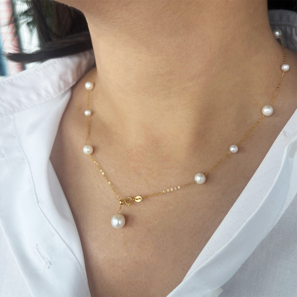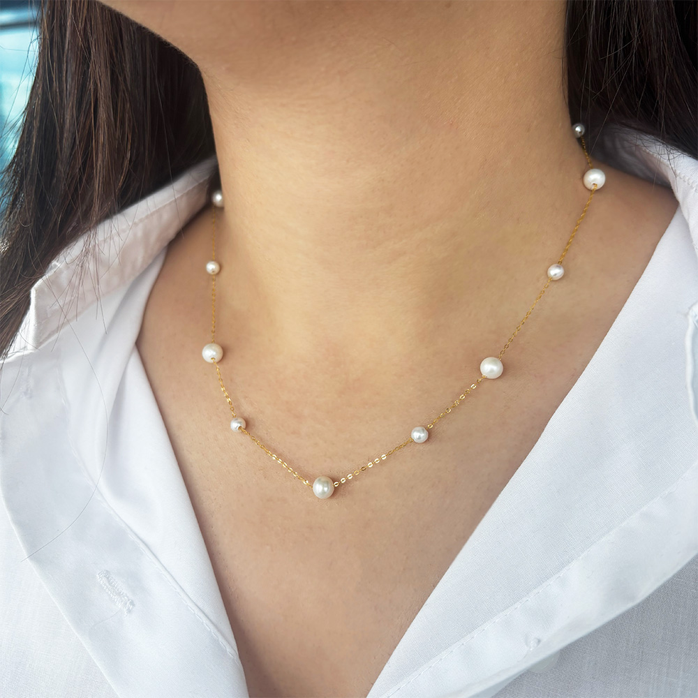 • Ένα υπέροχο κολιέ με χρυσή αλυσίδα 18 καρατίων, η οποία είναι διακοσμημένη με 6 λευκά στρόγγυλα μαργαριτάρια Fresh Water Pearl διαμέτρου 4,5 χιλιοστών και 7 μαργαριτάρια διαμέτρου 6 χιλιοστών, με ιδιαίτερους φυσικούς ιριδισμούς.
