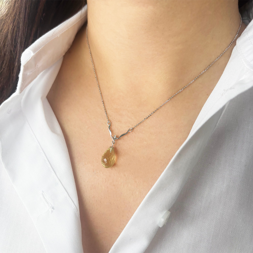 Το μενταγιόν καταλήγει σε ημιπολύτιμο λίθο Lemon Quartz φασεταρισμένο με διάσταση 9x15 χιλιοστών σε σχήμα σταγόνας.