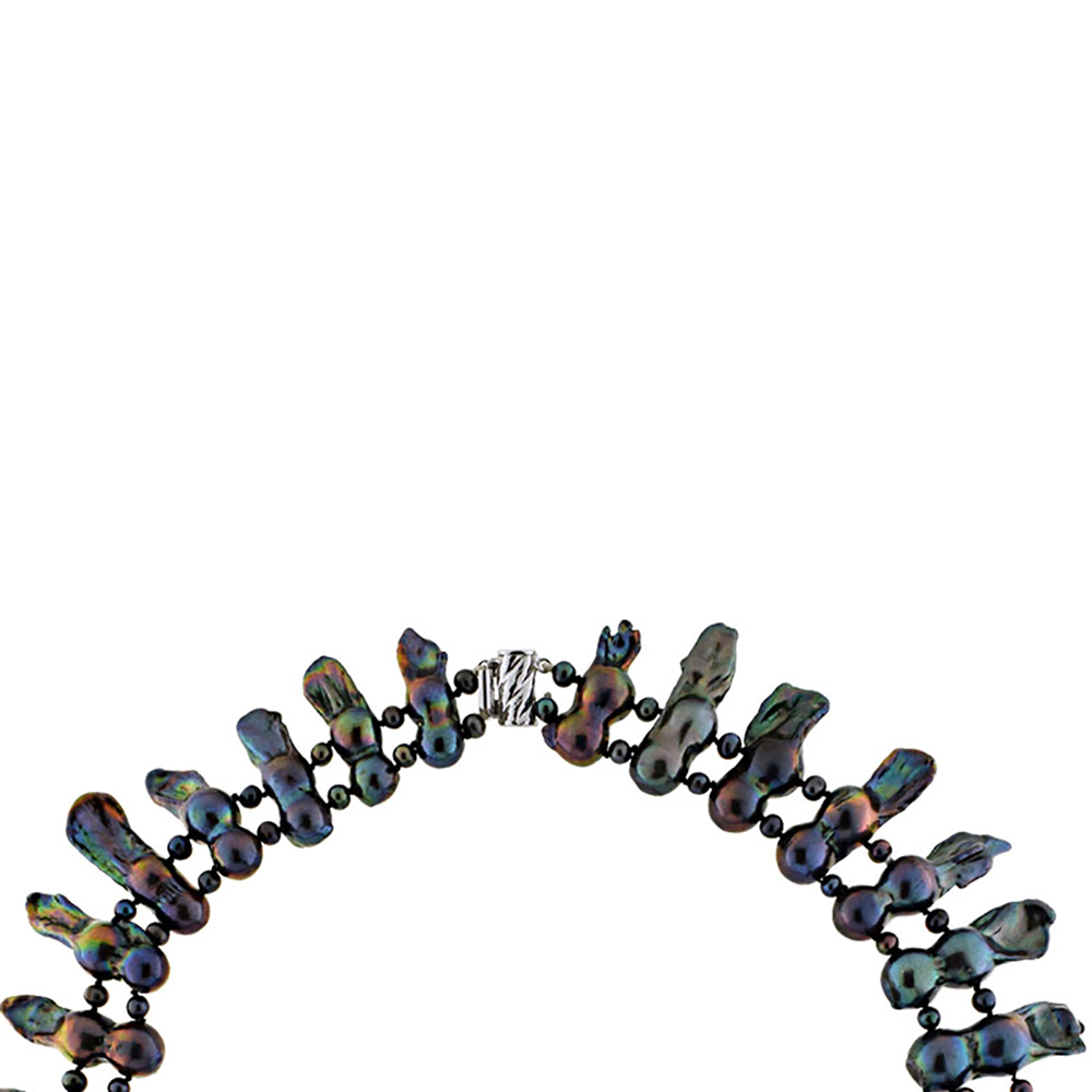 Ανάμεσα στα Baroque μαργαριτάρια υπάρχουν 2 σειρές μαύρα μαργαριτάρια Fresh Water Pearl διαμέτρου 4,5-5 χιλιοστών, άριστης ποιότητας σε σχήμα Round.