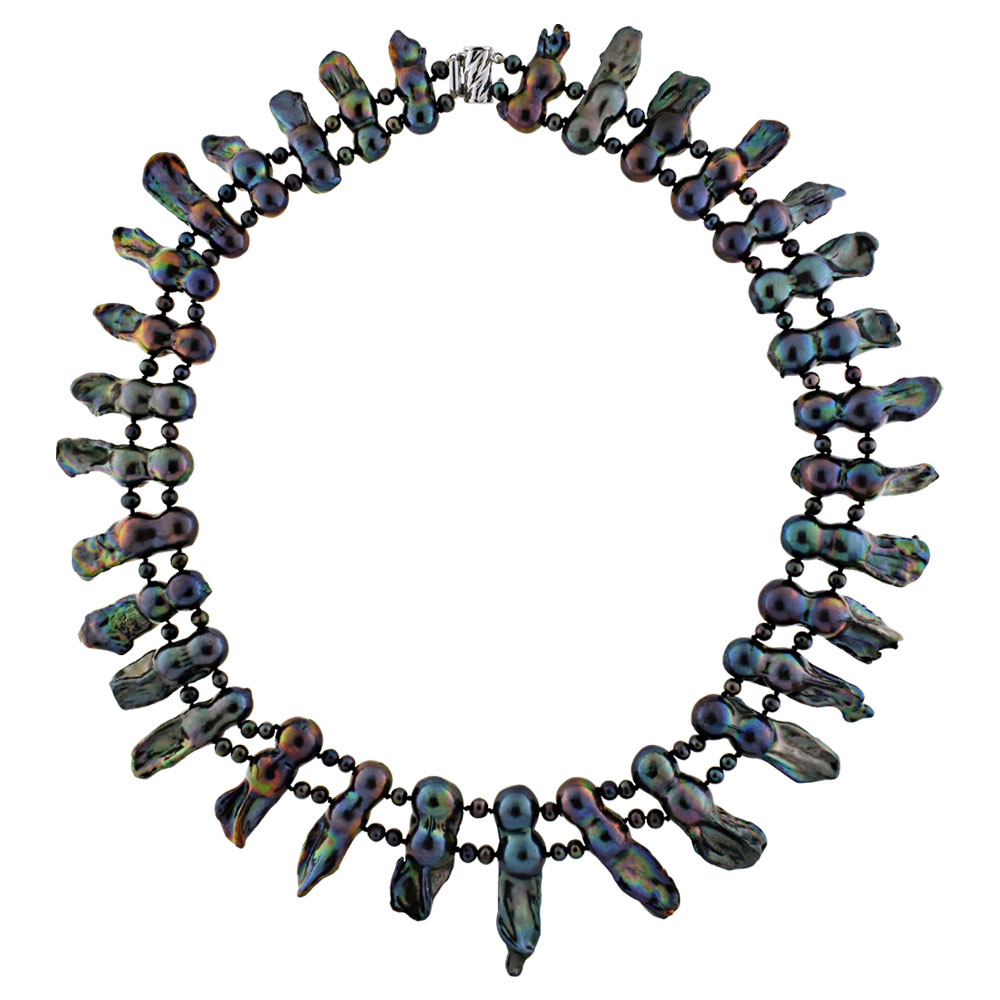 • Ένα φανταστικό κολιέ από 32 εντυπωσιακά φυσικά και σπάνια μαύρα μαργαριτάρια Biwa Fresh Water Pearl διαμέτρου 10x21 χιλιοστών, σε σχήμα Baroque.