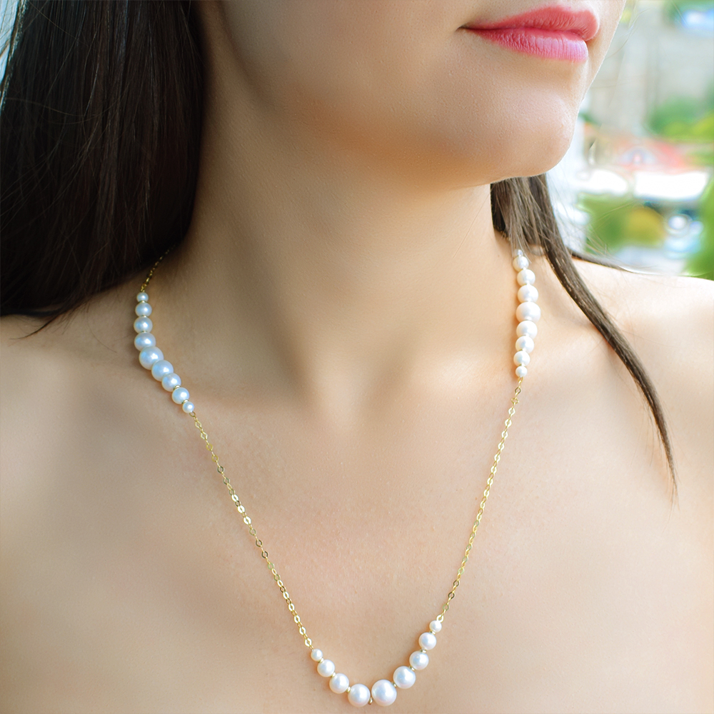 • Ένα μοναδικό κολιέ με χρυσή αλυσίδα 14 καρατιών και 27 μαργαριτάρια degrade γλυκού νερού Fresh Water Pearl διαμέτρου από έως 8 χιλιοστών.