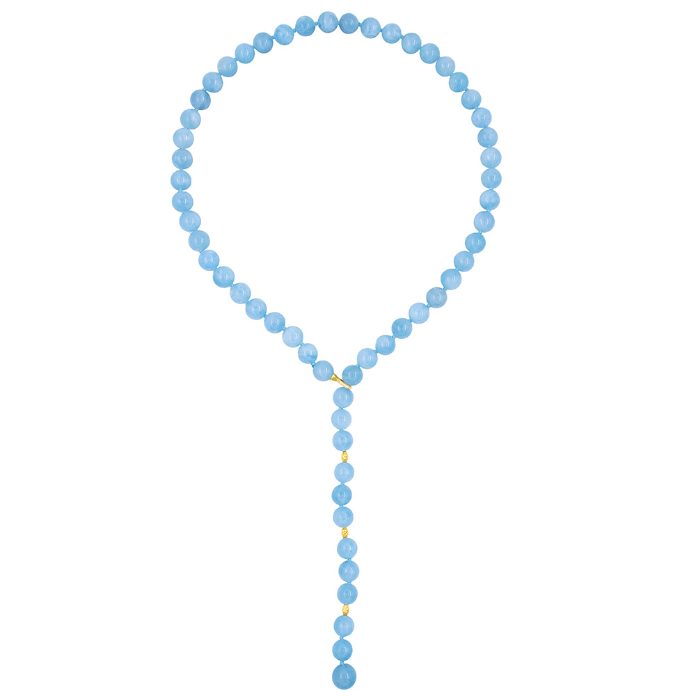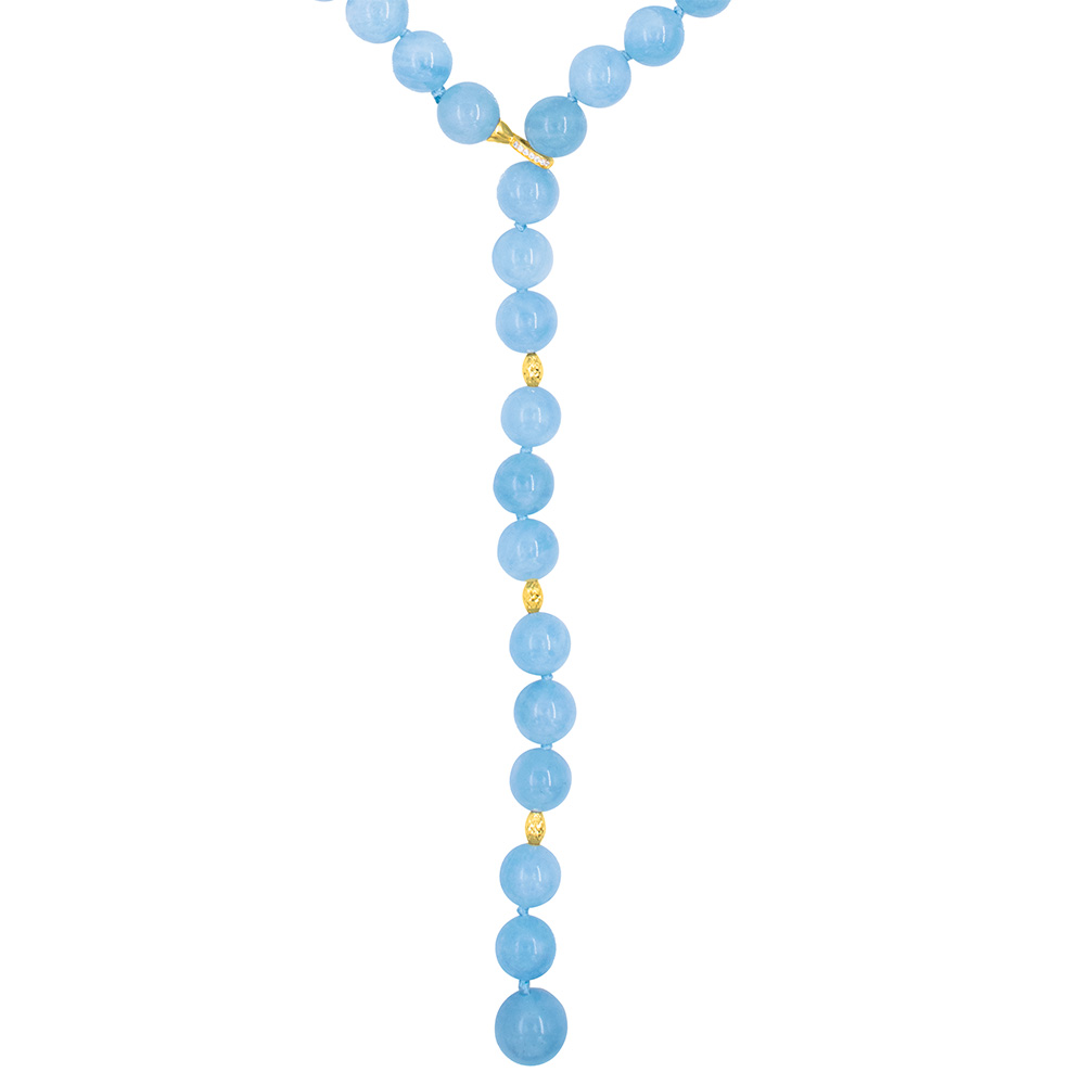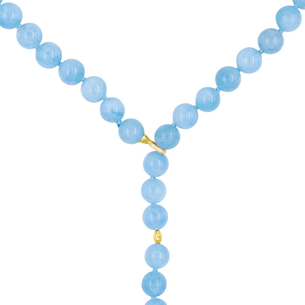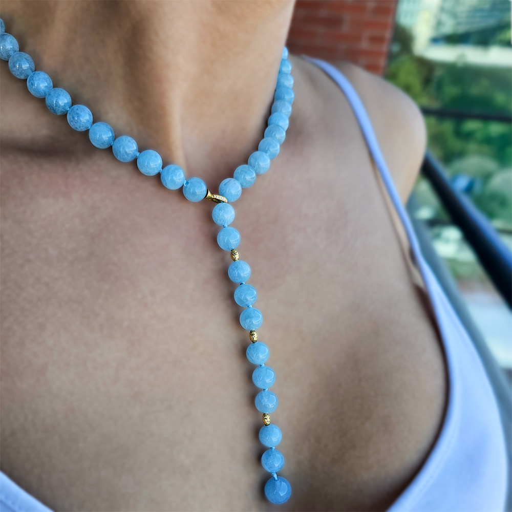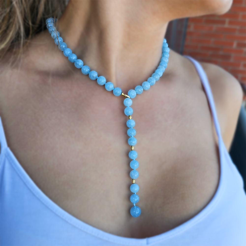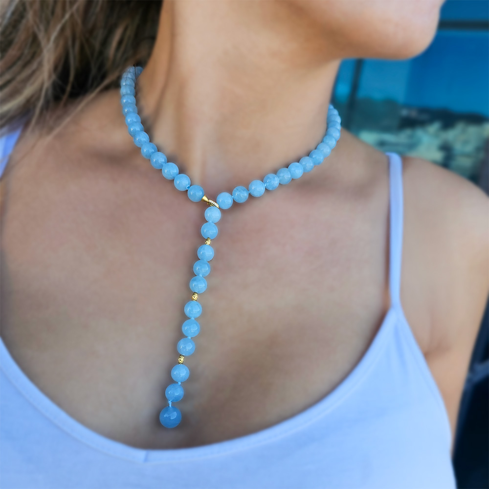 • Ένα υπέροχο κολιέ με στρόγγυλο ημιπολύτιμο λίθο Aqua διαμέτρου 8 χιλιοστών και καταλήγει σε ένα Aqua διαμέτρου 10 χιλιοστών.