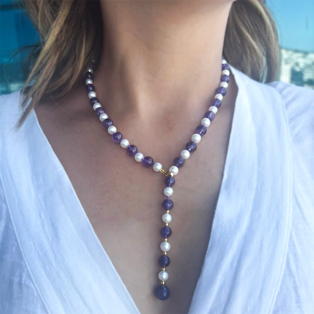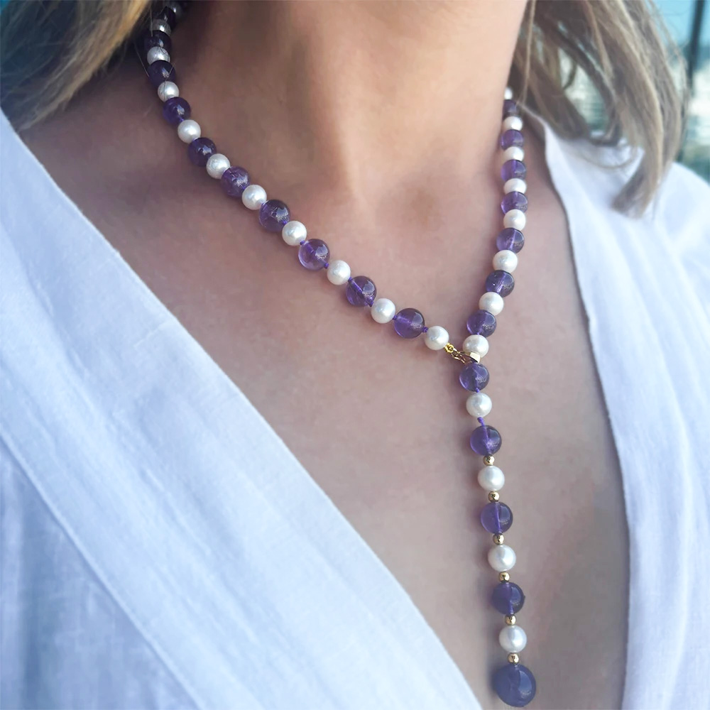 Είναι δεμένο με μεταξωτό νήμα που δημιουργεί κόμπους ενδιάμεσα στα μαργαριτάρια και στους αμέθυστους για λόγους προστασίας και ασφάλειας.