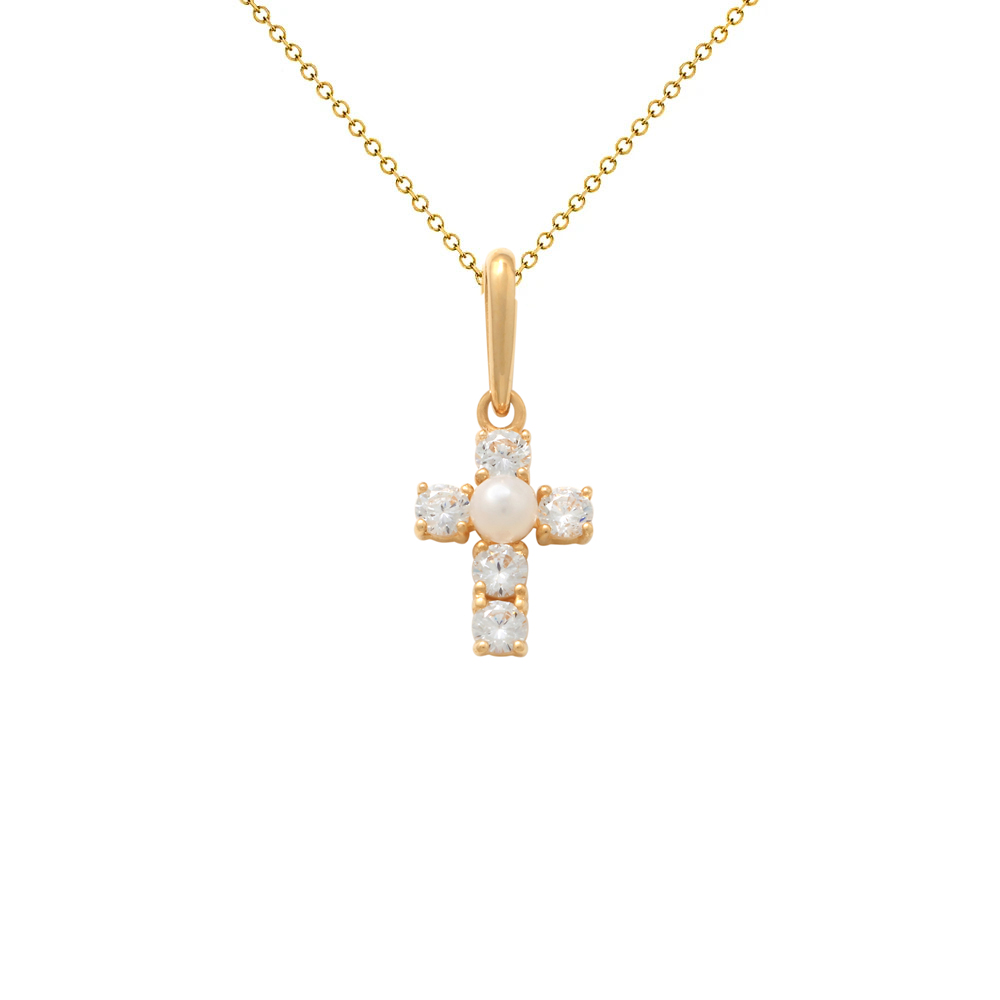 Κολιέ με Κ14 χρυσή αλυσίδα και σταυρό με ζιργκόν και μαργαριτάρι - F125285CH