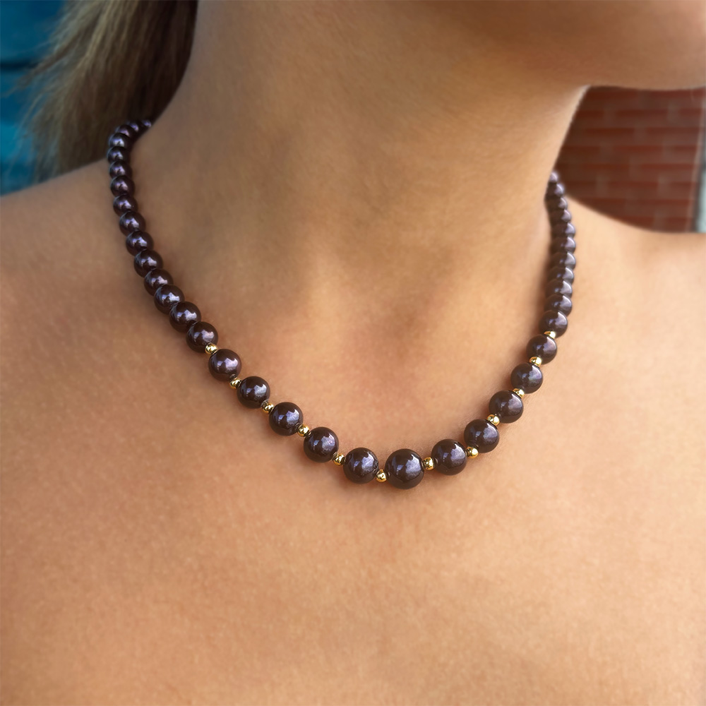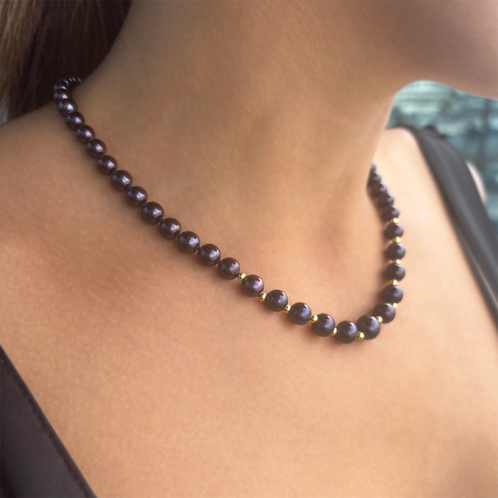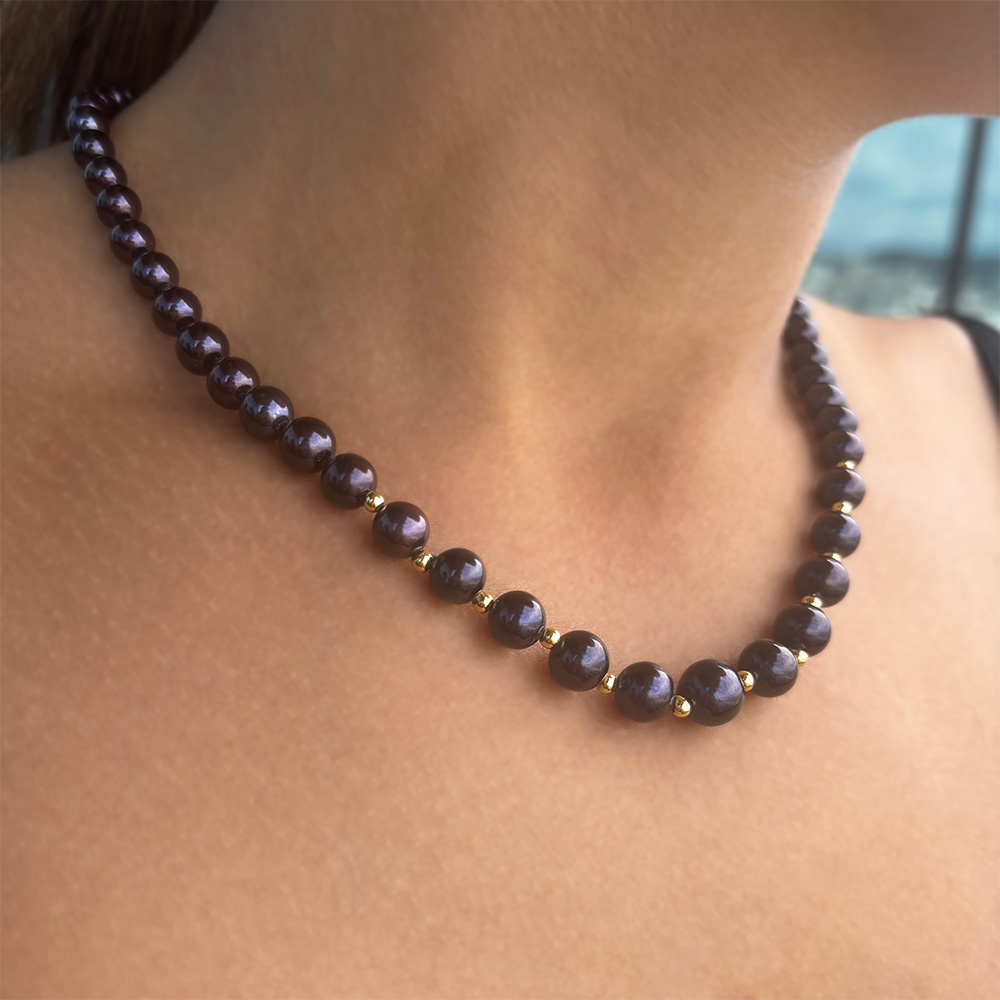 • Ένα υπέροχο κολιέ από μαύρα μαργαριτάρια Fresh Water Pearl διαμέτρου 6- 10 χιλιοστών σε σχήμα στρόγγυλο.