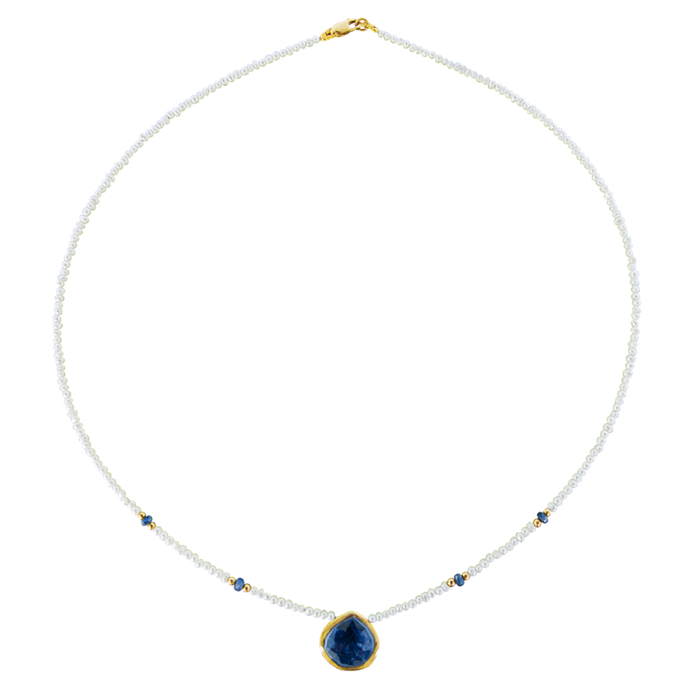 Κολιέ με λευκά μαργαριτάρια, ζαφείρια και χρυσό κούμπωμα 14K - M121221S