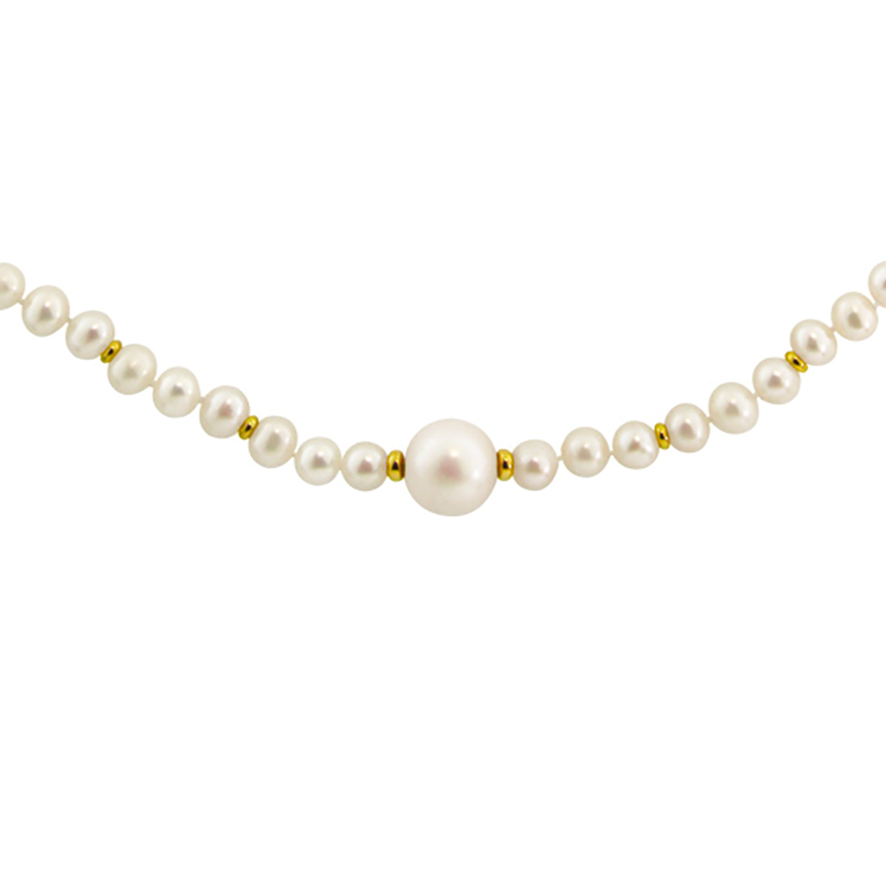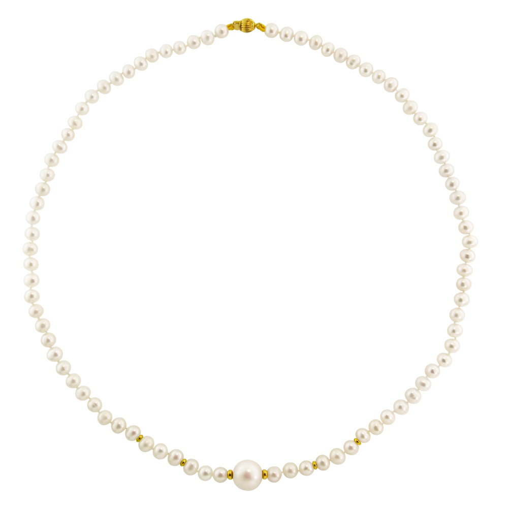 Στο κέντρο του κολιέ υπάρχει ένα λευκό μαργαριτάρι γλυκού νερού Fresh Water Pearl διαμέτρου 9,5 - 10 χιλιοστών, άριστης ποιότητας ανάμεσα σε 2 χρυσές ροδέλες 14 καρατίων.