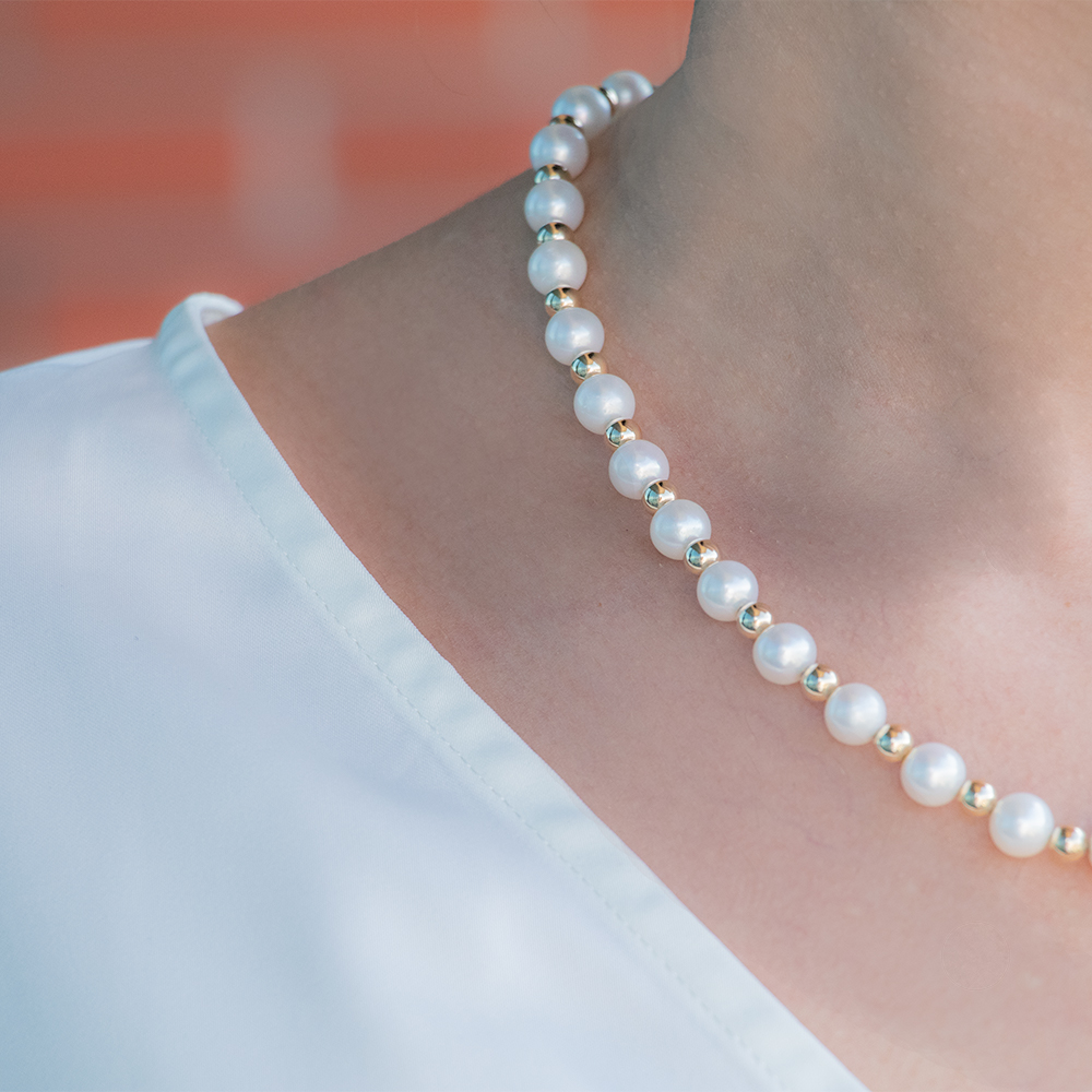 • Ένα υπέροχο κολιέ με λευκά μαργαριτάρια Fresh Water Pearl διαμέτρου 8 χιλιοστών.