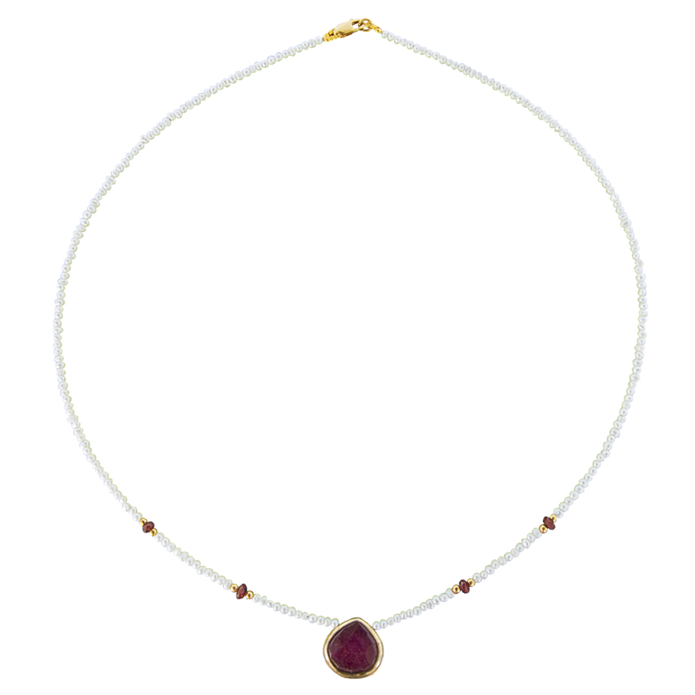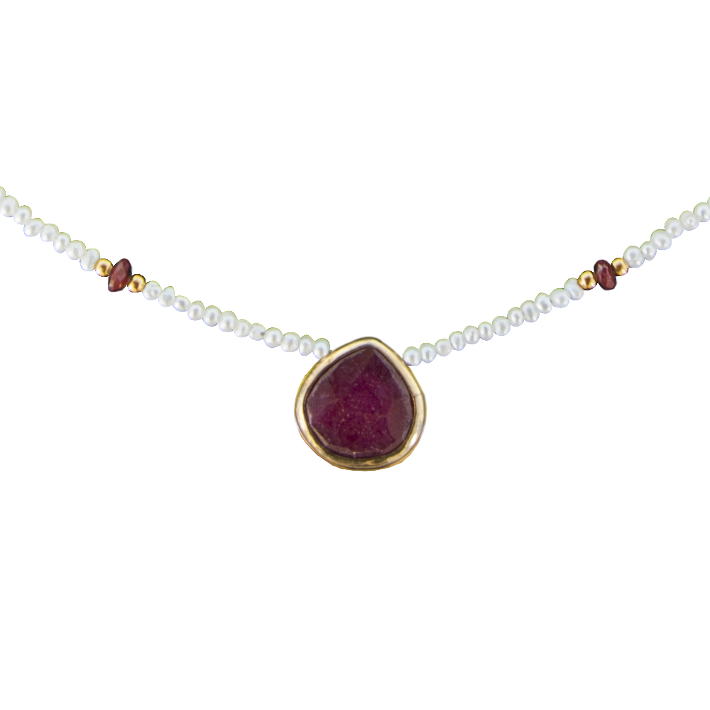 Κολιέ με λευκά μαργαριτάρια, ρουμπίνια και χρυσό κούμπωμα 14K - M121221R
