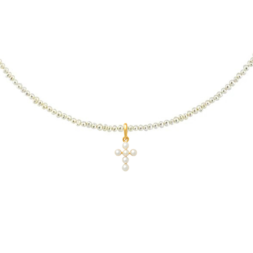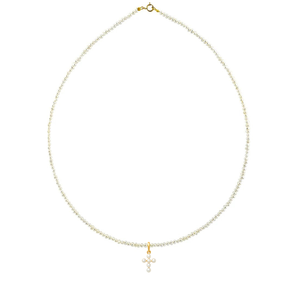 Κολιέ με λευκά μαργαριτάρια, χρυσό σταυρό και κούμπωμα Κ14 - M125026