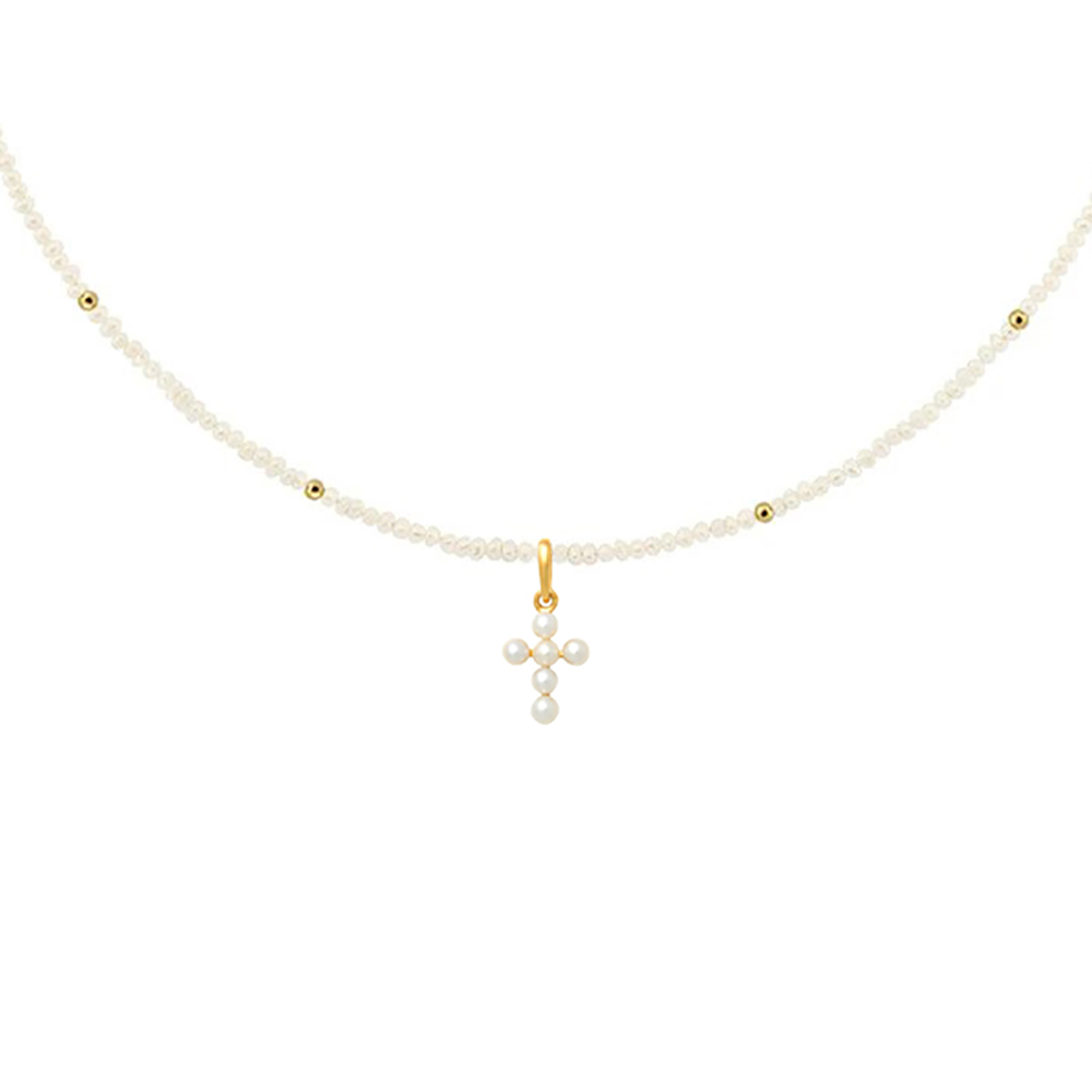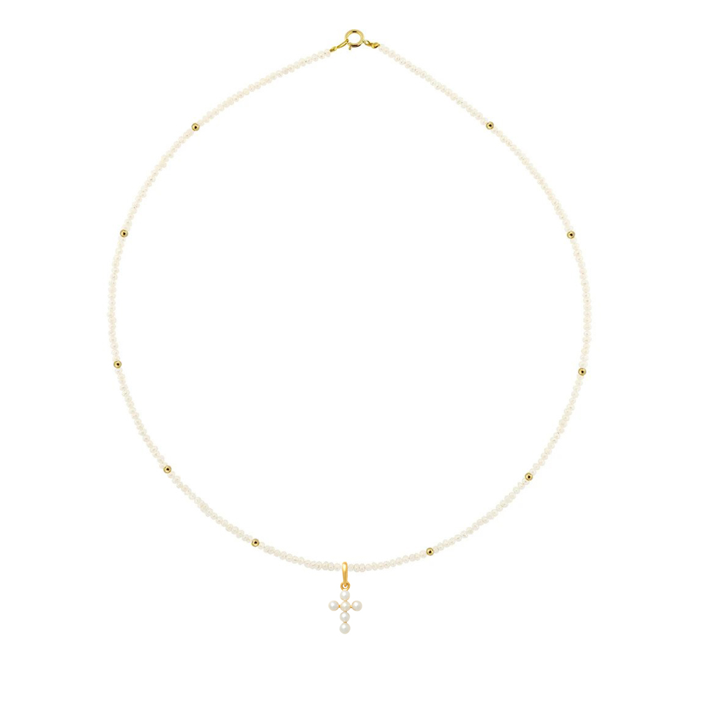 Κολιέ με λευκά μαργαριτάρια, χρυσό σταυρό,στοιχεία και κούμπωμα Κ14 - M125028