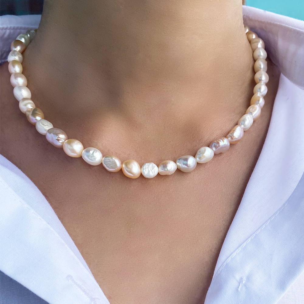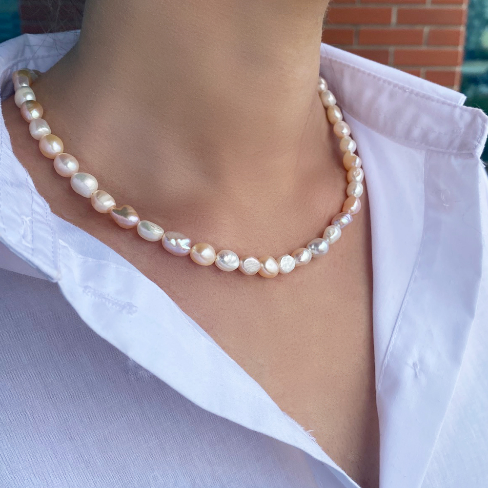 • Ένα υπέροχο κολιέ με εντυπωσιακά σομόν ακατέργαστα φυσικά μαργαριτάρια διαμέτρου 7 x 11 χιλιοστών σε σχήμα Long