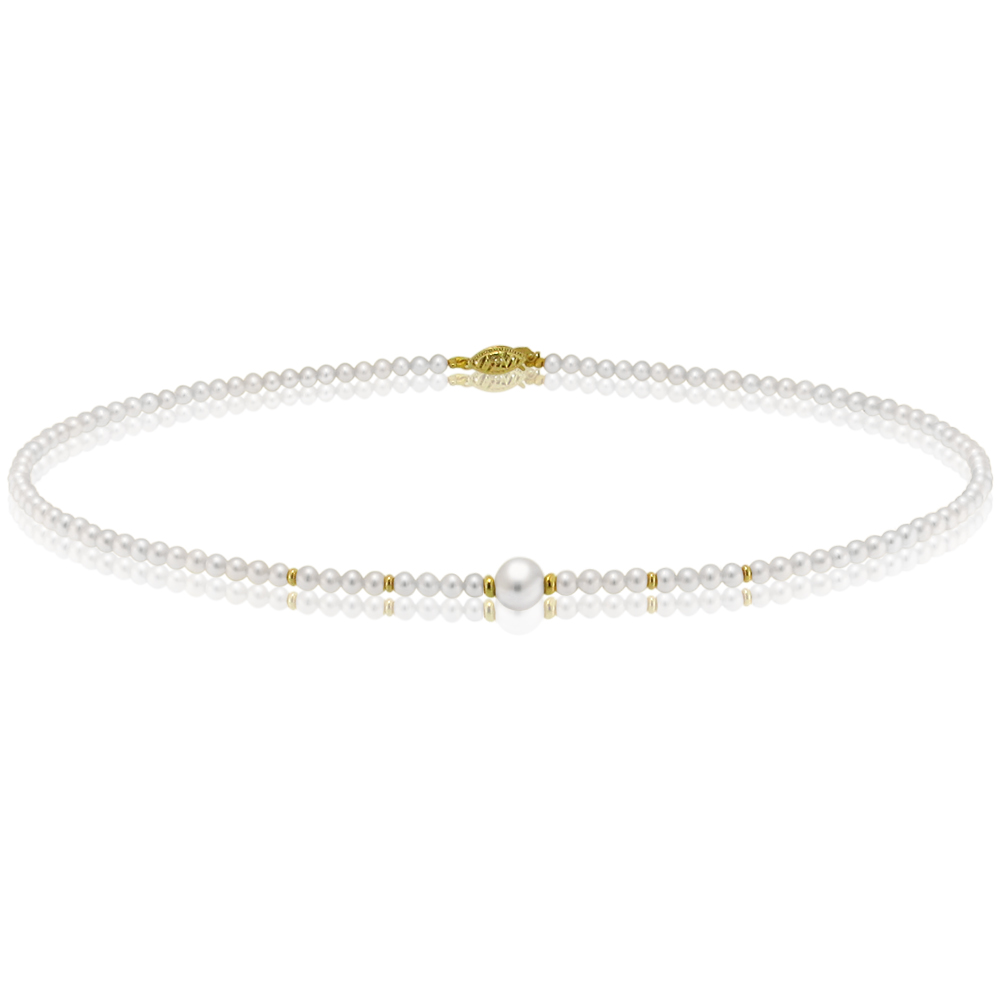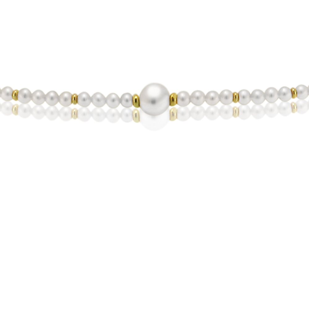 Ανάμεσα στα μαργαριτάρια στο κάτω μέρος του κολιέ, υπάρχουν 6 χρυσές ροδέλες των 14 καρατίων και στο κέντρο του ένα εντυπωσιακό λευκό μαργαριτάρι γλυκού νερού Fresh Water Pearl διαμέτρου 8 χιλιοστών.