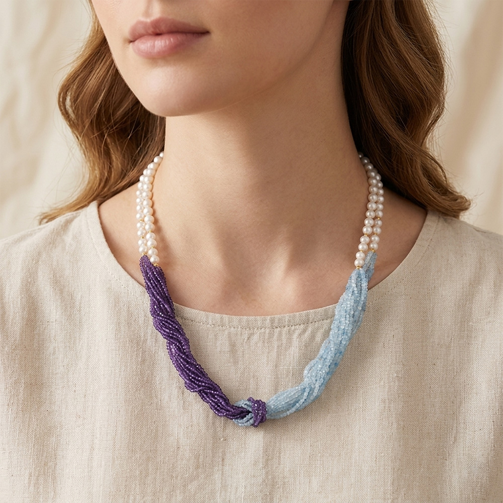 • Ένα υπέροχο πολλαπλό κολιέ με μαργαριτάρια και ημιπολύτιμους λίθους το οποίο δημιουργείτε όταν κάνουμε κόμπο σε 2 ξεχωριστά κολιέ.
