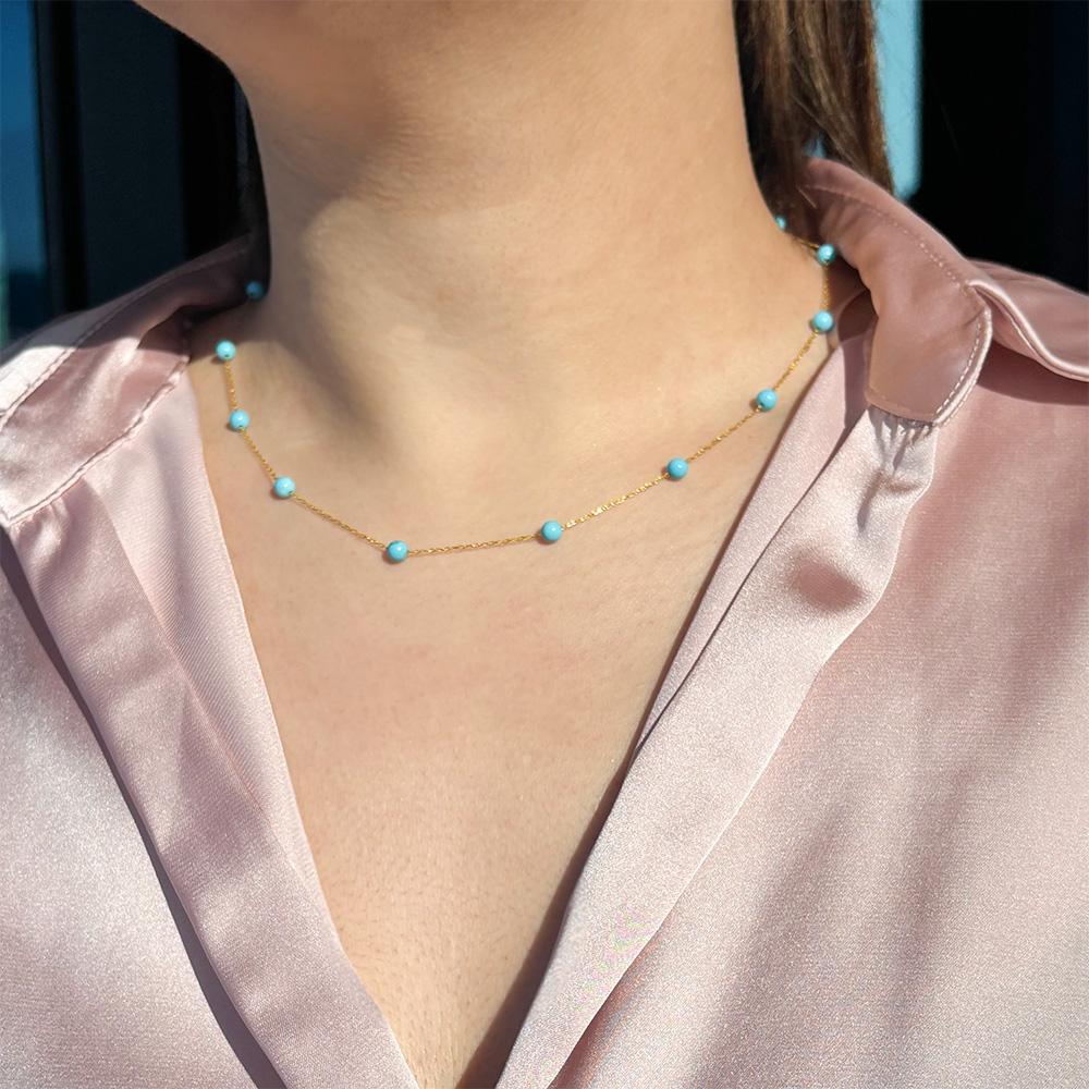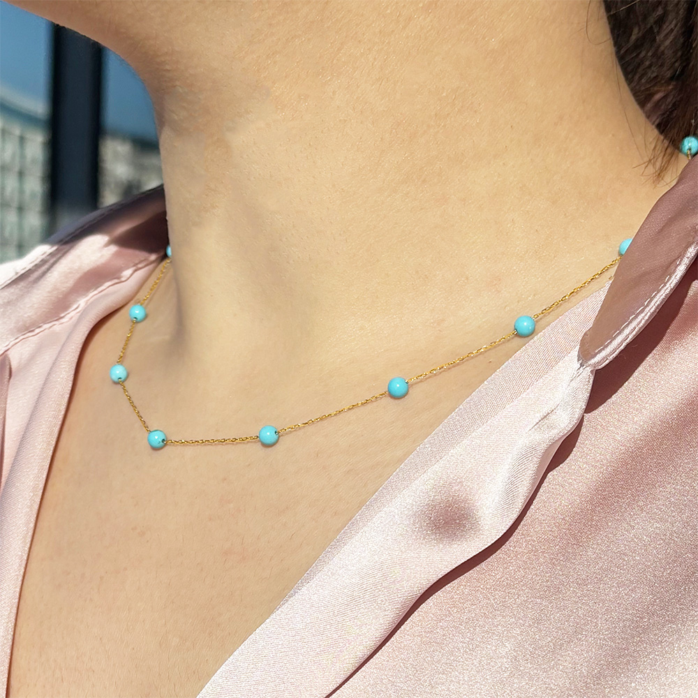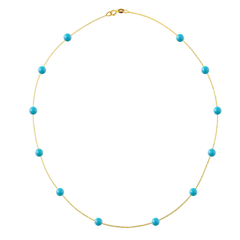 • Ένα υπέροχο κολιέ με 12 τιρκουάζ 4 χιλιοστών σε σχήμα Round (στρογγυλό).