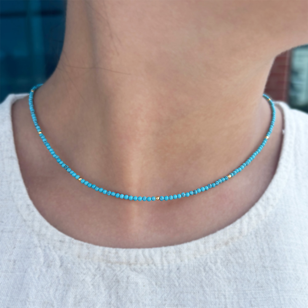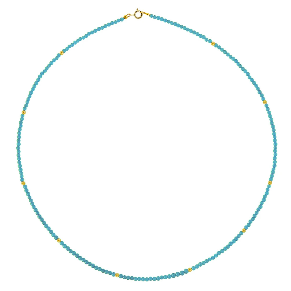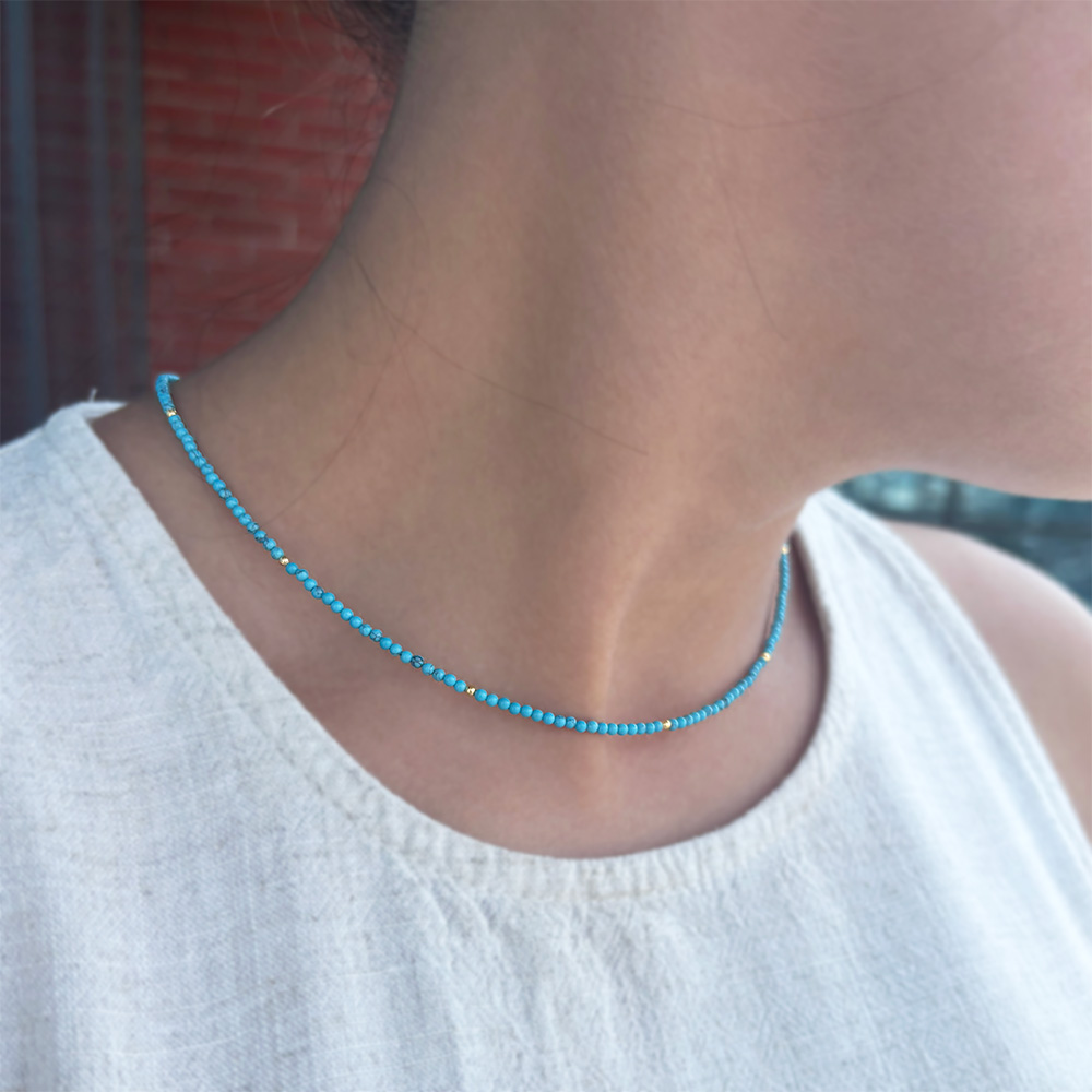 • Ένα υπέροχο κολιέ με χρυσό κούμπωμα 14 καρατίων και τιρκουάζ διαμέτρου 2 - 2,5 χιλιοστών.