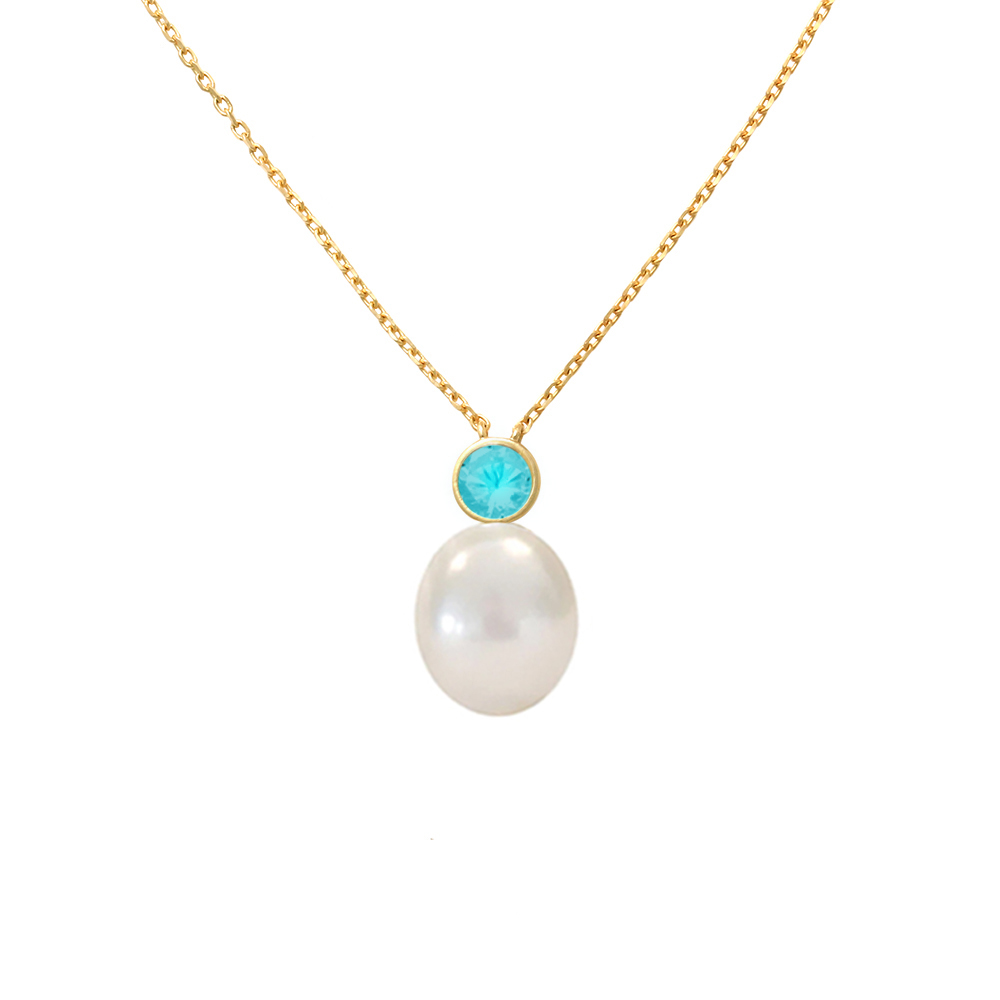 Κολιέ με Κ14 χρυσή αλυσίδα, λευκό μαργαριτάρι και μπλε ζιργκόν - F124570BL