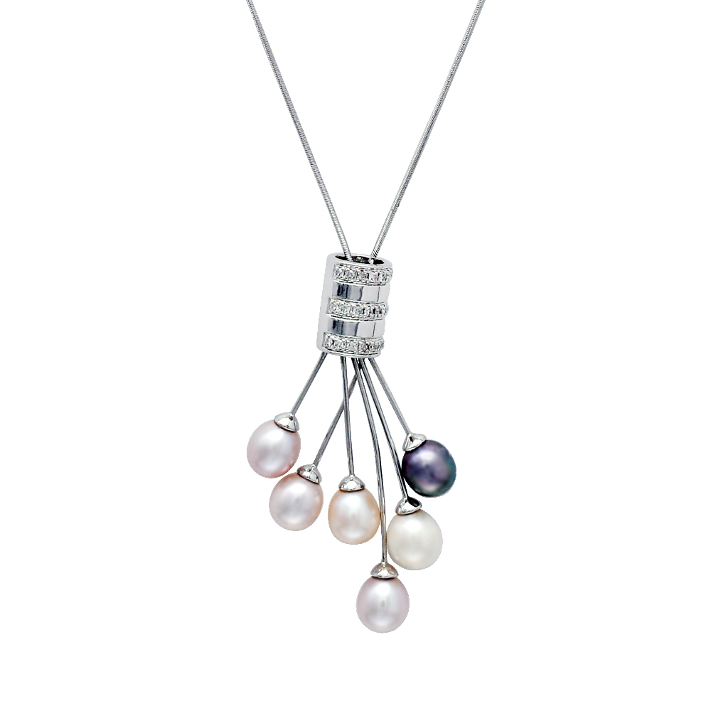 • Ένα μοναδικό κολιέ με 6 πολύχρωμα μαργαριτάρια Fresh Water Pearl σχήματος Drop (σταγόνα), διαμέτρου 6,5 x 8,5 χιλιοστών άριστης ποιότητας, σε λευκόχρυση αλυσίδα 18 καρατίων.
