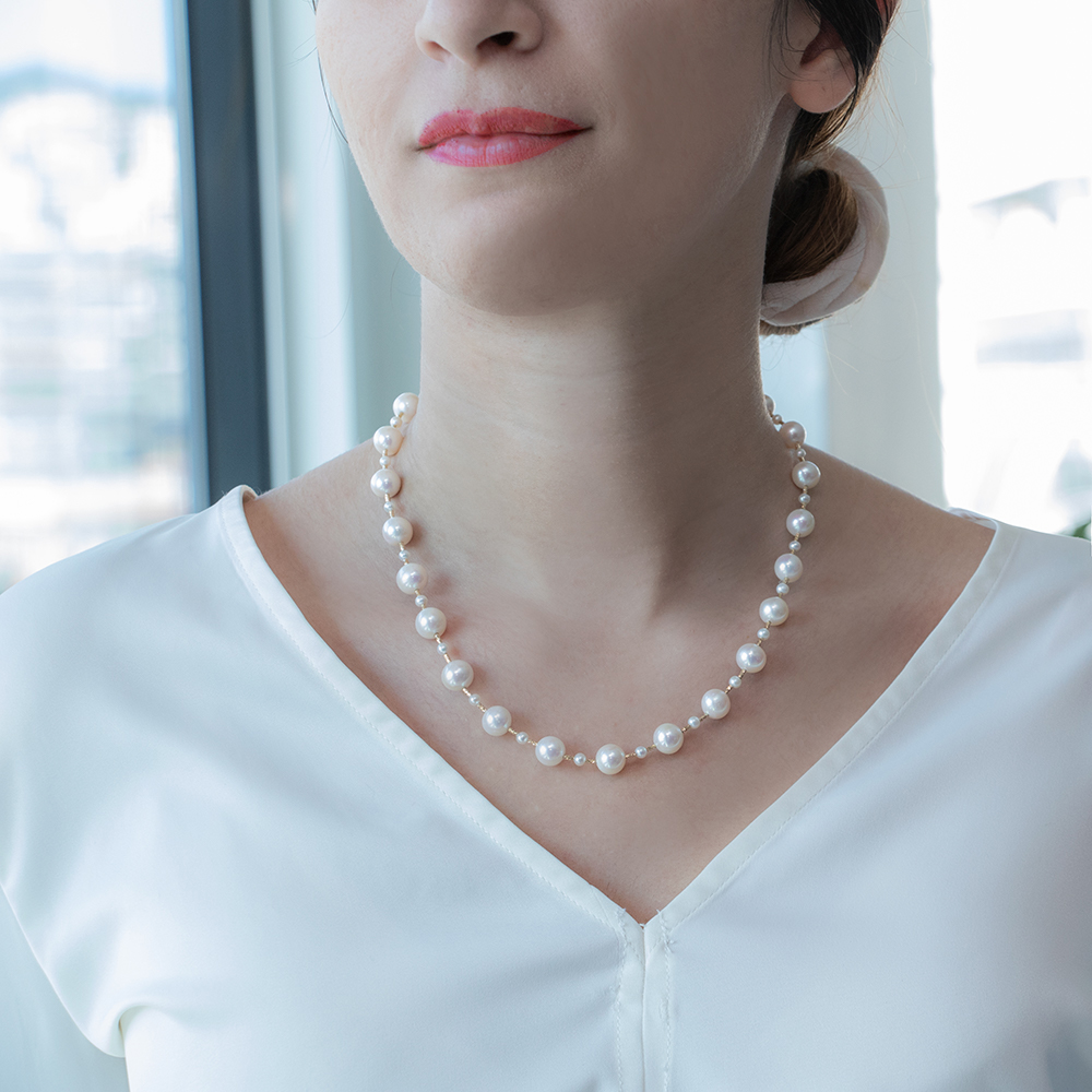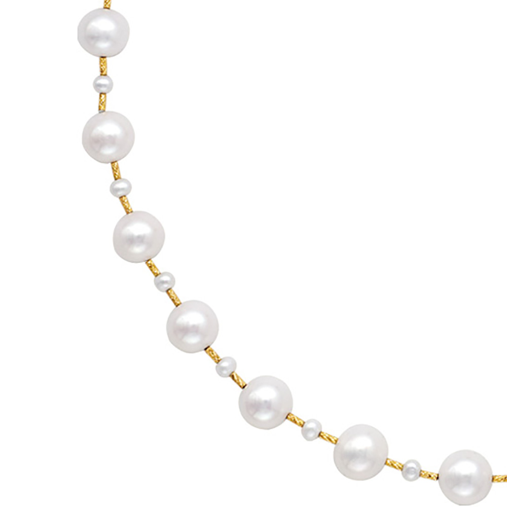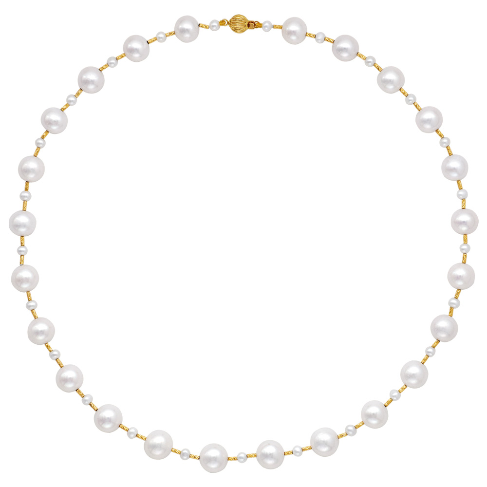 • Ένα φανταστικό κολιέ με 25 λευκά μαργαριτάρια γλυκού νερού Fresh Water Pearl διαμέτρου 3,5 -4 χιλιοστών και 24 λευκά μαργαριτάρια γλυκού νερού Fresh Water Pearl διαμέτρου 10 χιλιοστών άριστης ποιότητας σε σχήμα Round (στρόγγυλο).