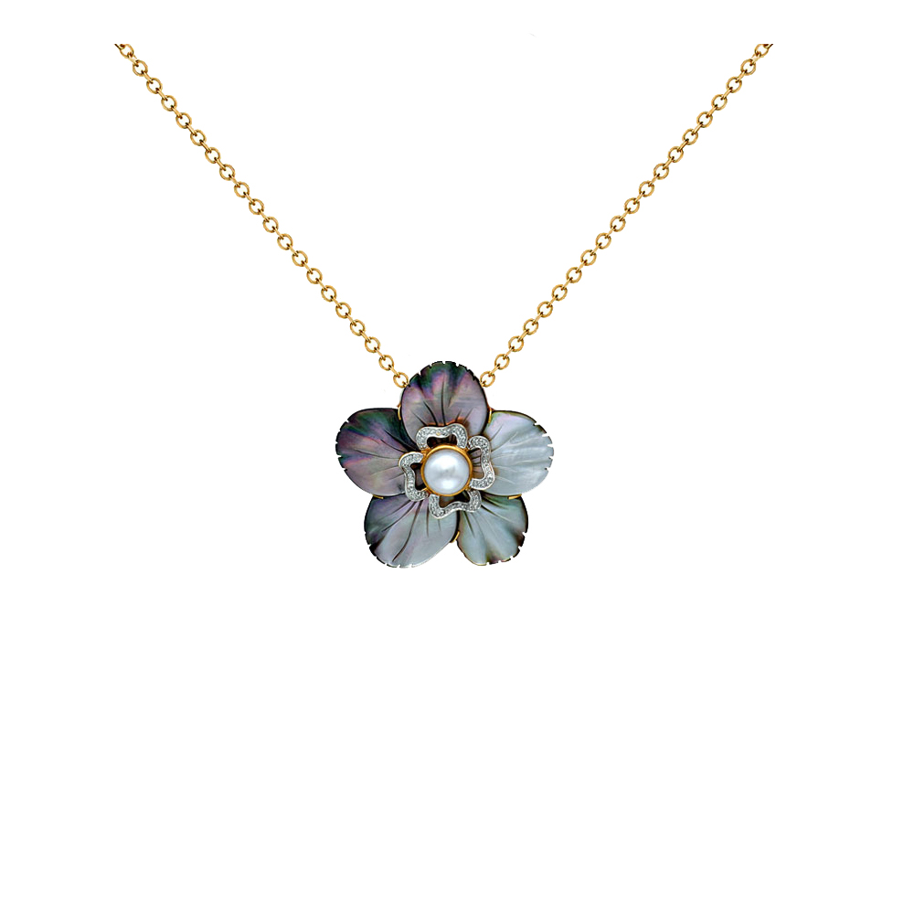 • Ένα μοναδικό κολιέ με λουλούδι δημιουργημένο από το εσωτερικό μέρος μαργαριτοφόρου οστράκου (Mother Of Pearl) διαμέτρου εκατοστών.