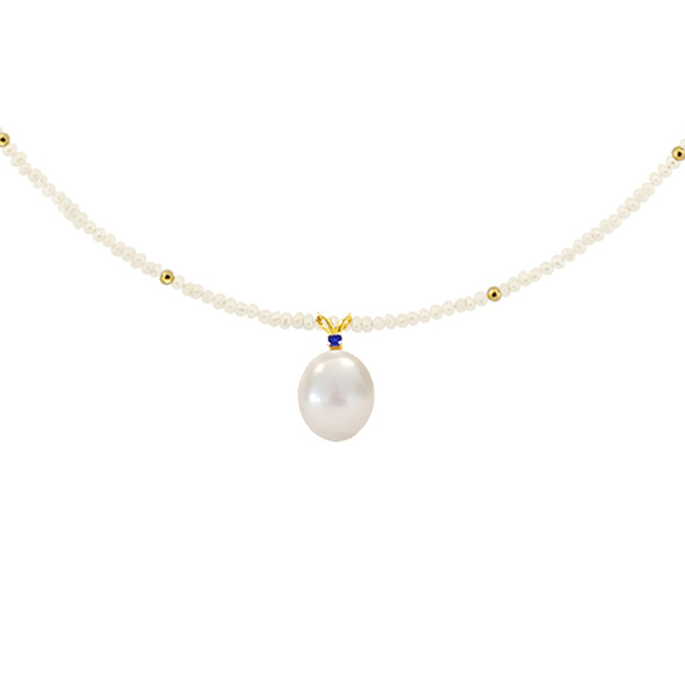 Στο κέντρο του κολιέ υπάρχει ένα μενταγιόν με λευκό μαργαριτάρι Fresh Water Pearl διαμέτρου 9x13 χιλιοστών σε σχήμα Drop σε χρυσή βάση 14 καρατίων με ένα ζαφείρι