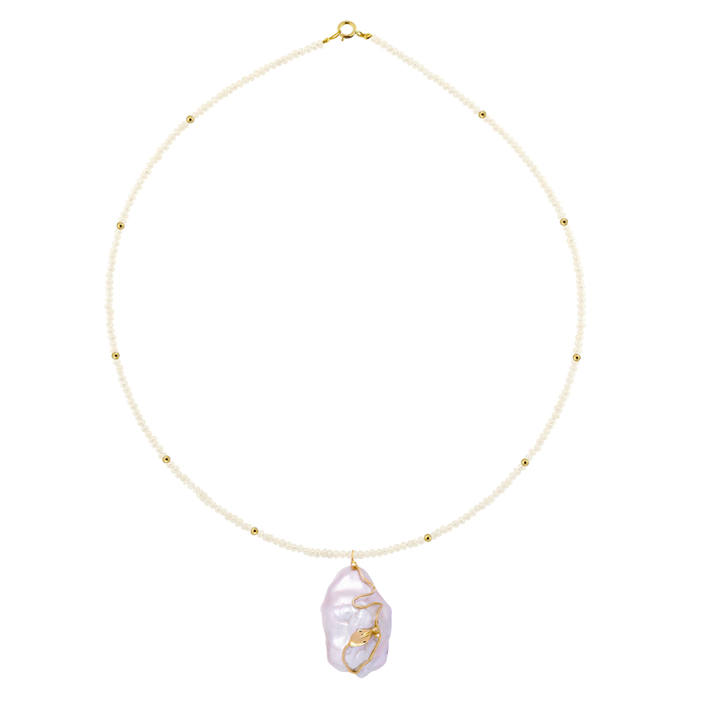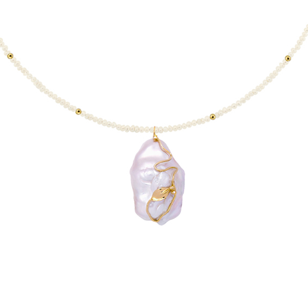 Στο κέντρο του κολιέ υπάρχει ένα χειροποίητο μενταγιόν με λευκό ακατέργαστο μαργαριτάρι Biwa Fresh Water Pearl, σε σχήμα Baroque διαμέτρου, διαμέτρου 32x20 χιλιοστών σε χρυσή χειροποίητη βάση 18 καρατίων με 2 διαμάντια 0,02ct.