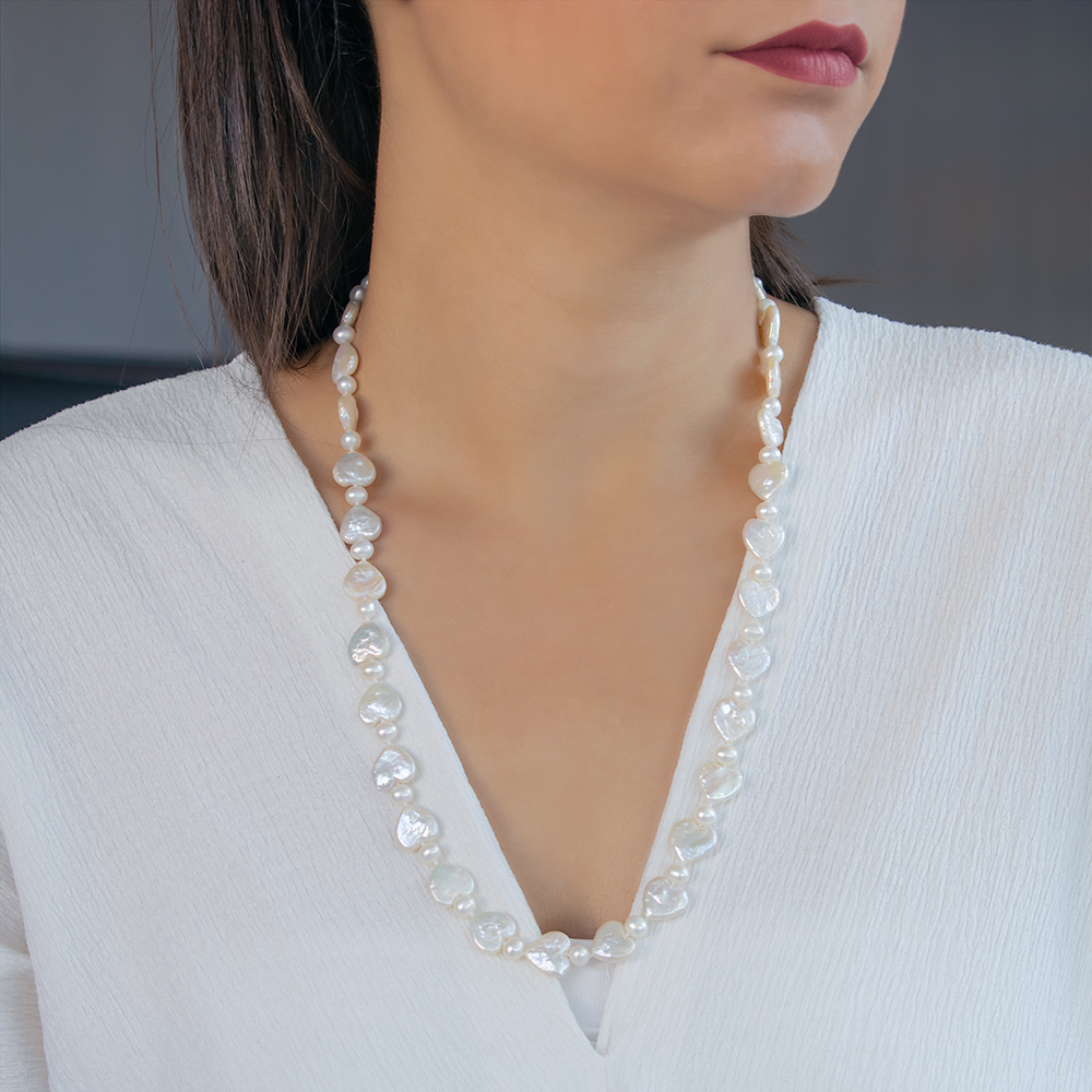 • Ένα υπέροχο κολιέ από φυσικού Baroque σχηματισμού λευκά μαργαριτάρια γλυκού νερού Fresh Water Pearl διαμέτρου 12 χιλιοστά.
