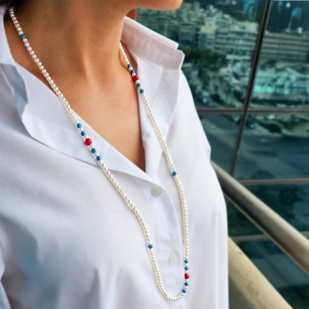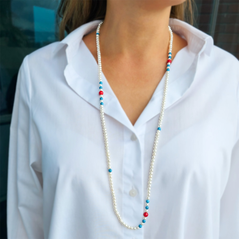 Νέο Κολιέ με λευκά μαργαριτάρια, κοράλλια, τιρκουάζ και κούμπωμα ατσάλι - F126615