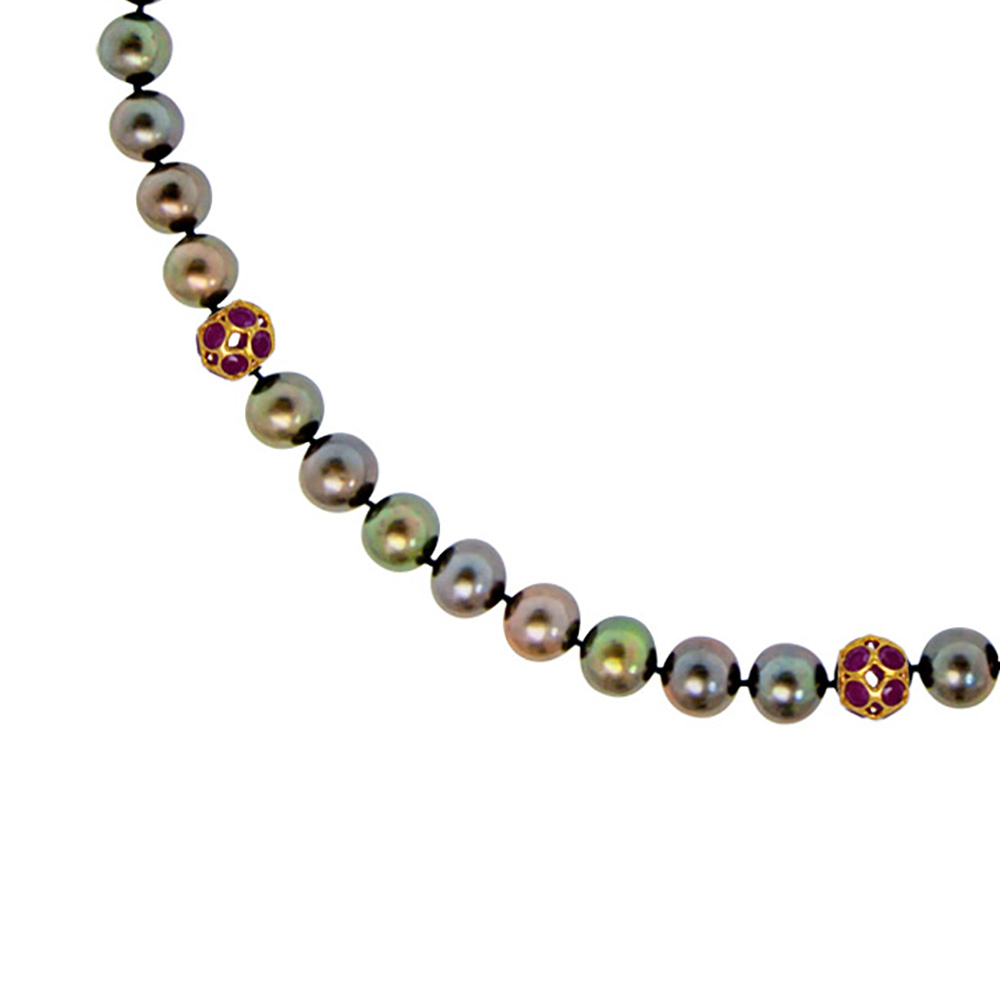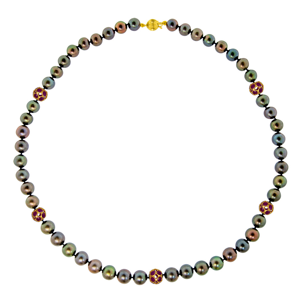 Κολιέ με Κ18 χρυσό κούμπωμα, μαύρα μαργαριτάρια και ρουμπίνια - M123868