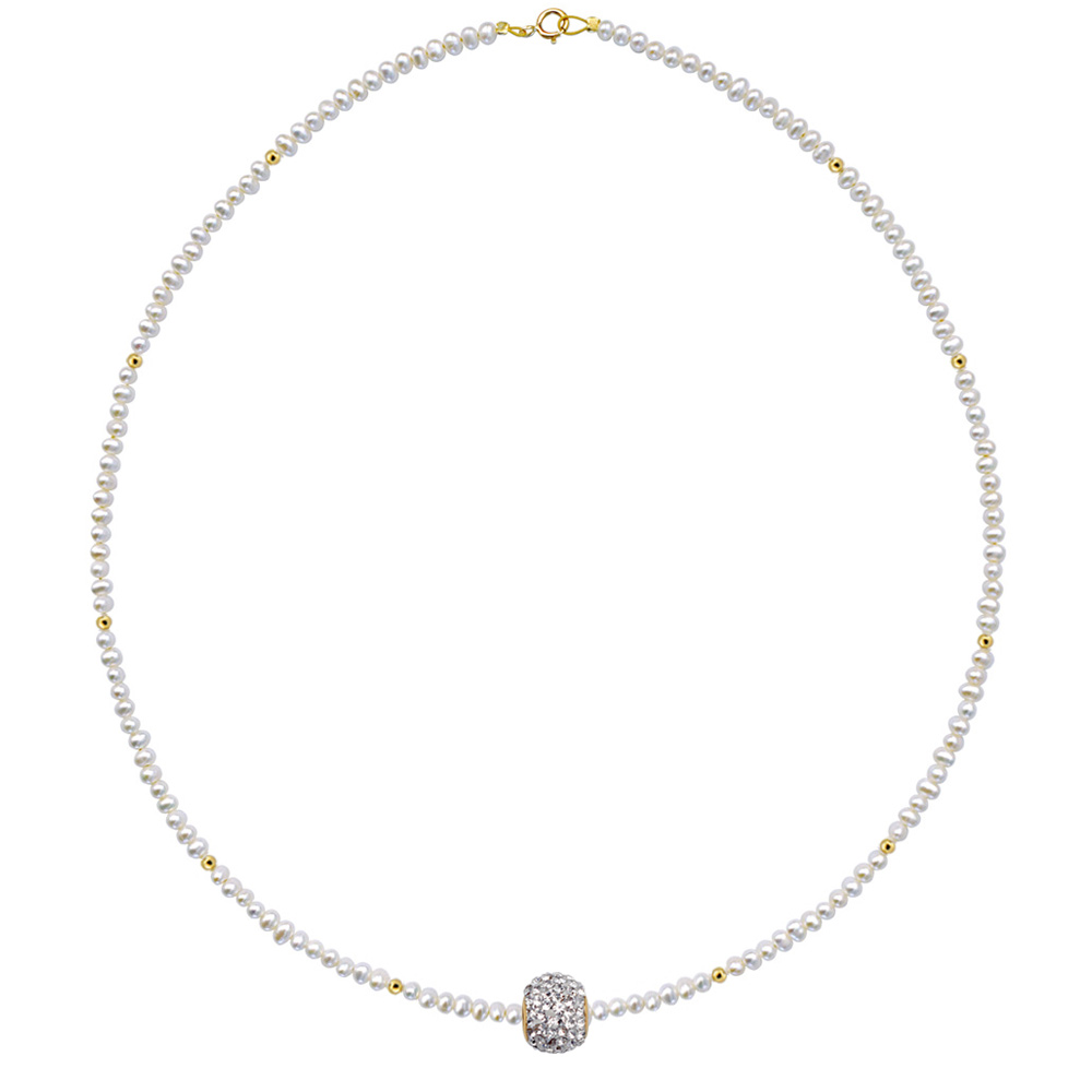 • Ένα υπέροχο κολιέ από λευκά μαργαριτάρια γλυκού νερού Fresh Water Pearl διαμέτρου 3,5- 4 χιλιοστών, άριστης ποιότητας με ένα υπέροχο μενταγιόν 14 καρατίων με αμέτρητα λευκά ζιρκόν σε σχήμα Round (στρογγυλό), διαμέτρου 12 χιλιοστών και πάχος 10 χιλιοστά